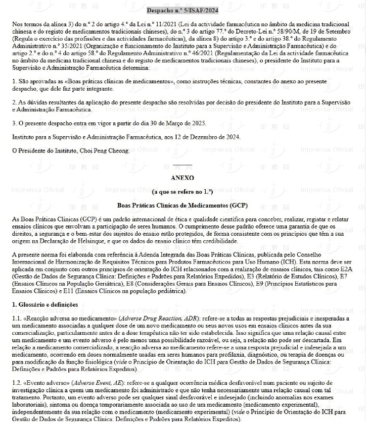 As instruções técnicas sobre as “Boas práticas clínicas de medicamentos (GCP)” foram elaboradas com referência à vigente Adenda Integrada das Boas Práticas Clínicas, publicada pelo Conselho Internacional de Harmonização de Requisitos Técnicos para Produtos Farmacêuticos para Uso Humano (ICH), e em articulação com as necessidades do desenvolvimento dos ensaios clínicos da medicina tradicional chinesa em Macau, com o objectivo de controlar rigorosamente todo o processo de ensaios clínicos de medicamentos, fornecendo dados completos, precisos e verdadeiros sobre a eficácia e a segurança dos medicamentos e garantindo os direitos, a segurança e o bem-estar dos sujeitos do ensaio. As GCP fornecem um suporte importante para a realização dos ensaios clínicos, articulando-se com os recursos dos dois Laboratórios de Referência do Estado para Investigação de Qualidade em Medicina Chinesa de Macau, das instituições de ensino superior e das instituições de investigação e desenvolvimento clínico, entre outros, podendo, através dos ensaios clínicos, transformar os resultados da investigação científica em aplicações clínicas, no sentido de promover o desenvolvimento da investigação farmacêutica e dos medicamentos inovadores de Macau.