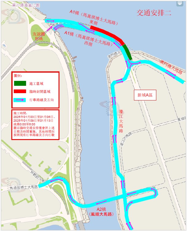 Será encerrada toda a faixa de rodagem do lado leste da via de acesso A1, passando a faixa de rodagem do lado oeste da via de acesso A1 a ser em dois sentidos, podendo os veículos circular pela faixa de rodagem do lado oeste da via de acesso A1 entre a Zona A e Península de Macau. |