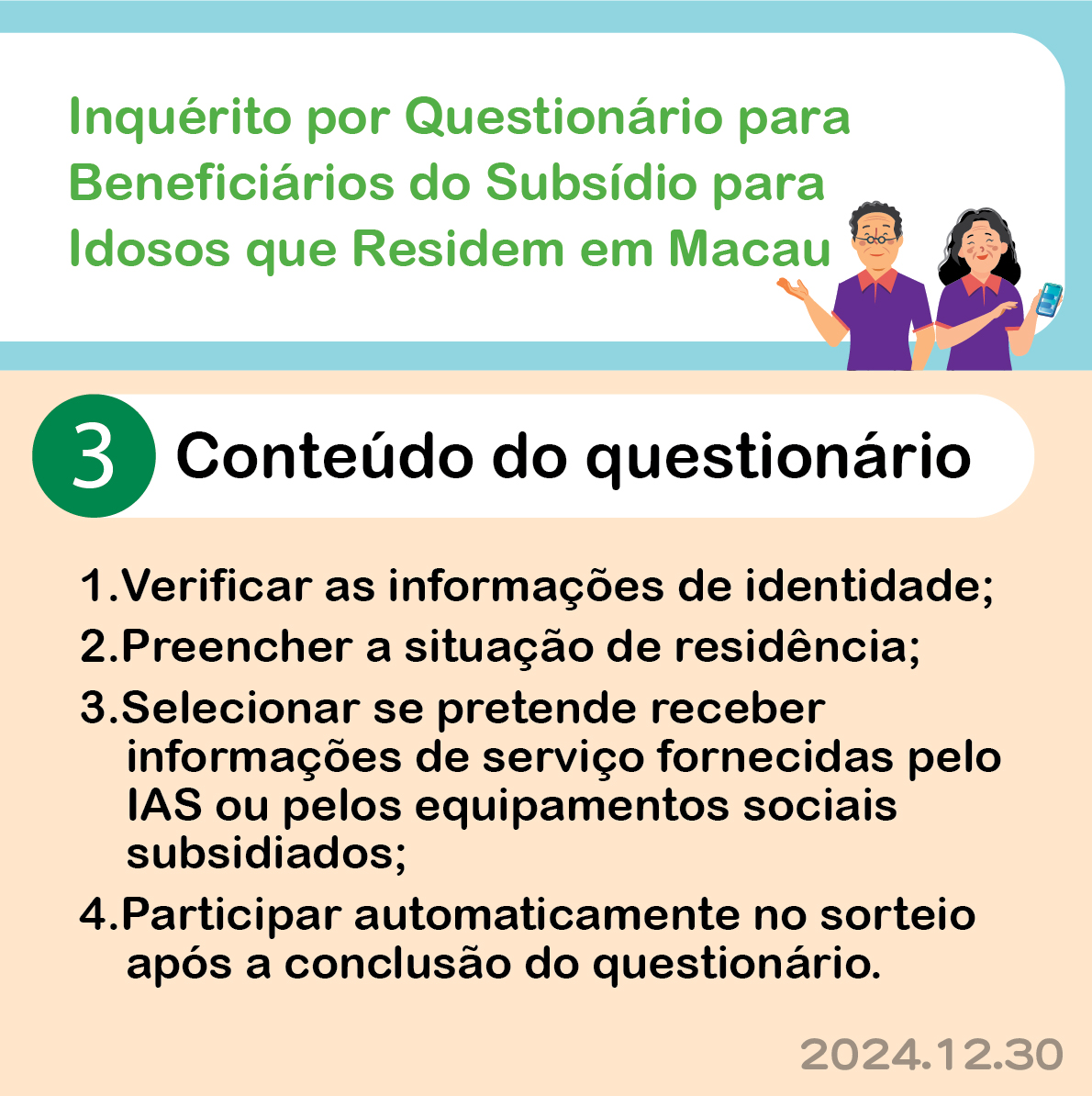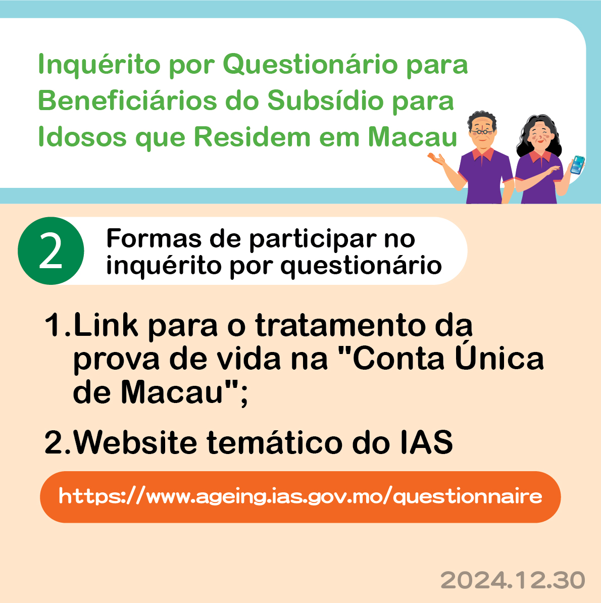 O IAS encoraja os beneficiários do Subsídio para Idosos, que residem em Macau e com idade igual ou superior a 65 anos, a preencherem, por si próprios ou com a ajuda de familiares e amigos, um questionário simples através do link para solicitar a prova de vida na "Conta Única de Macau", ou do website temático do IAS https://www.ageing.ias.gov.mo/questionnaire (é necessário fazer login). O conteúdo do questionário inclui a situação de residência e a vontade de recepção de informações de serviço fornecidas pelo Instituto de Acção Social ou pelos equipamentos sociais subsidiados. A fim de incentivar a participação, os beneficiários terão automaticamente a oportunidade de participar no sorteio, após a conclusão do questionário.