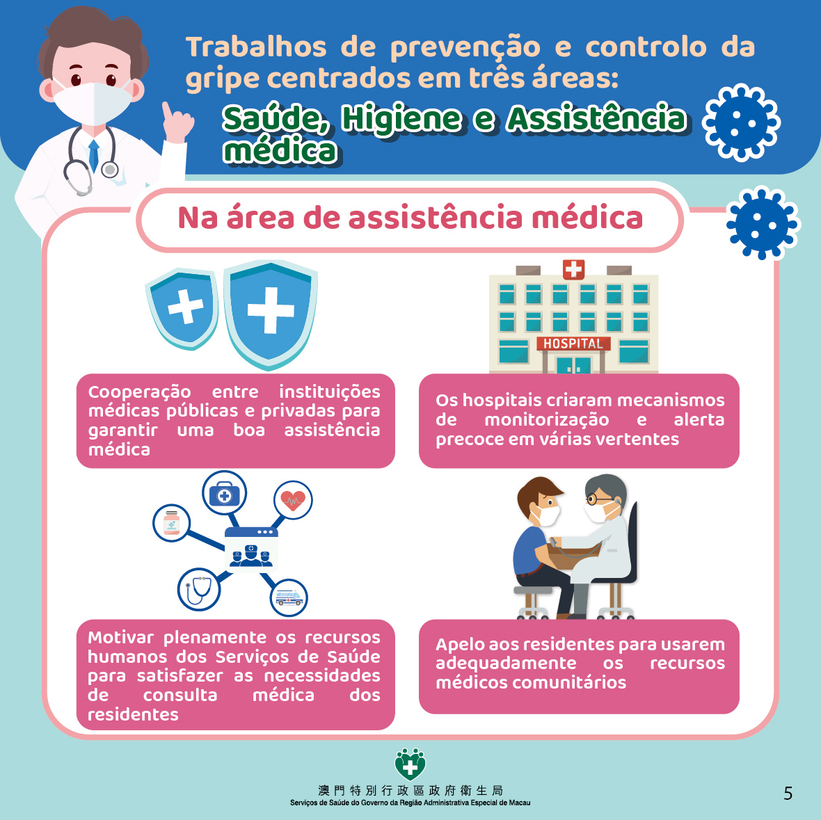 Os Serviços de Saúde, a DSEDJ e o IAS irão iniciar uma série de trabalhos interdepartamentais de prevenção e controlo, nomeadamente no que diz respeito à saúde, higiene e assistência médica. No que diz respeito à saúde, os Serviços de Saúde, em colaboração com as associações sociais e instituições médicas, irão instalar, no próximo fim-de-semana (18 e 19 de Janeiro), 15 postos comunitários de atendimento e informação para a prevenção da gripe junto de todas as zonas de Macau, com vista a reforçar a educação para a saúde e a promover a vacinação. No âmbito da higiene, foram produzidos vários materiais didácticos e infografias, de forma a promover a importância da manutenção da higiene pessoal e ambiental através da internet (página electrónica sobre informações de doenças transmissíveis: https://www.ssm.gov.mo/portal/csr/ch/main.aspx).