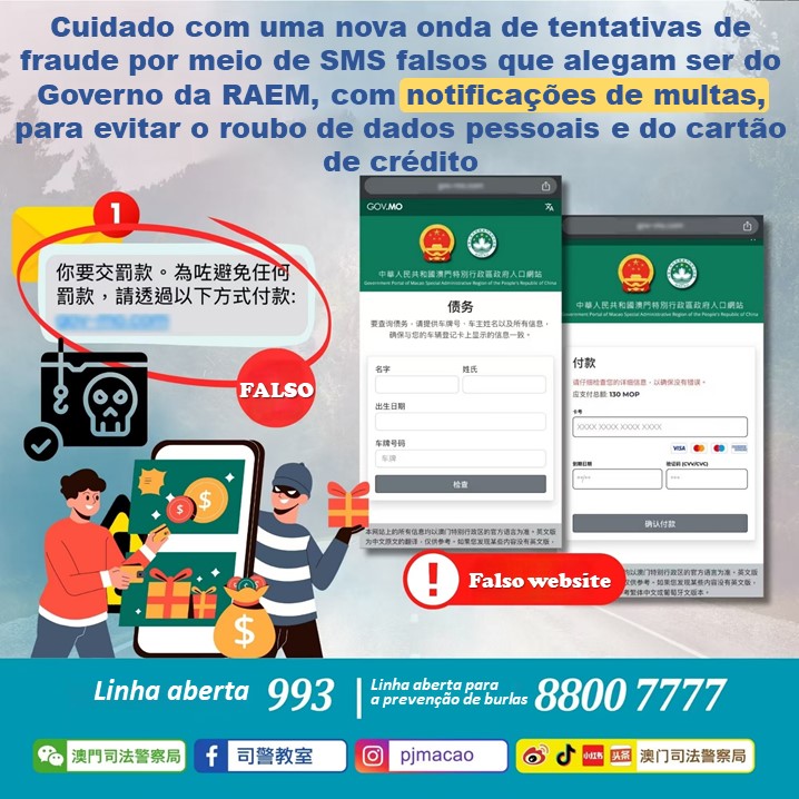 A Polícia Judiciária revelou hoje que existem casos em que alguém finge ser o Governo da RAEM enviando mensagens de texto em massa. As mensagens indicam que a pessoa tem que pagar uma multa e deve fazê-lo através de um link incluído na mensagem. Ao clicar nesse link, a pessoa é encaminhadas para uma página fraudulenta do “Portal do Governo da RAEM”, que alega falsamente que a vítima tem uma multa por “infração de trânsito” e pede a inserção de dados pessoais, número da matrícula do veículo e pagamento com cartão de crédito. O objetivo é obter os dados do cartão de crédito das vítimas e realizar transações de alto valor sem autorização, causando assim prejuízos financeiros..