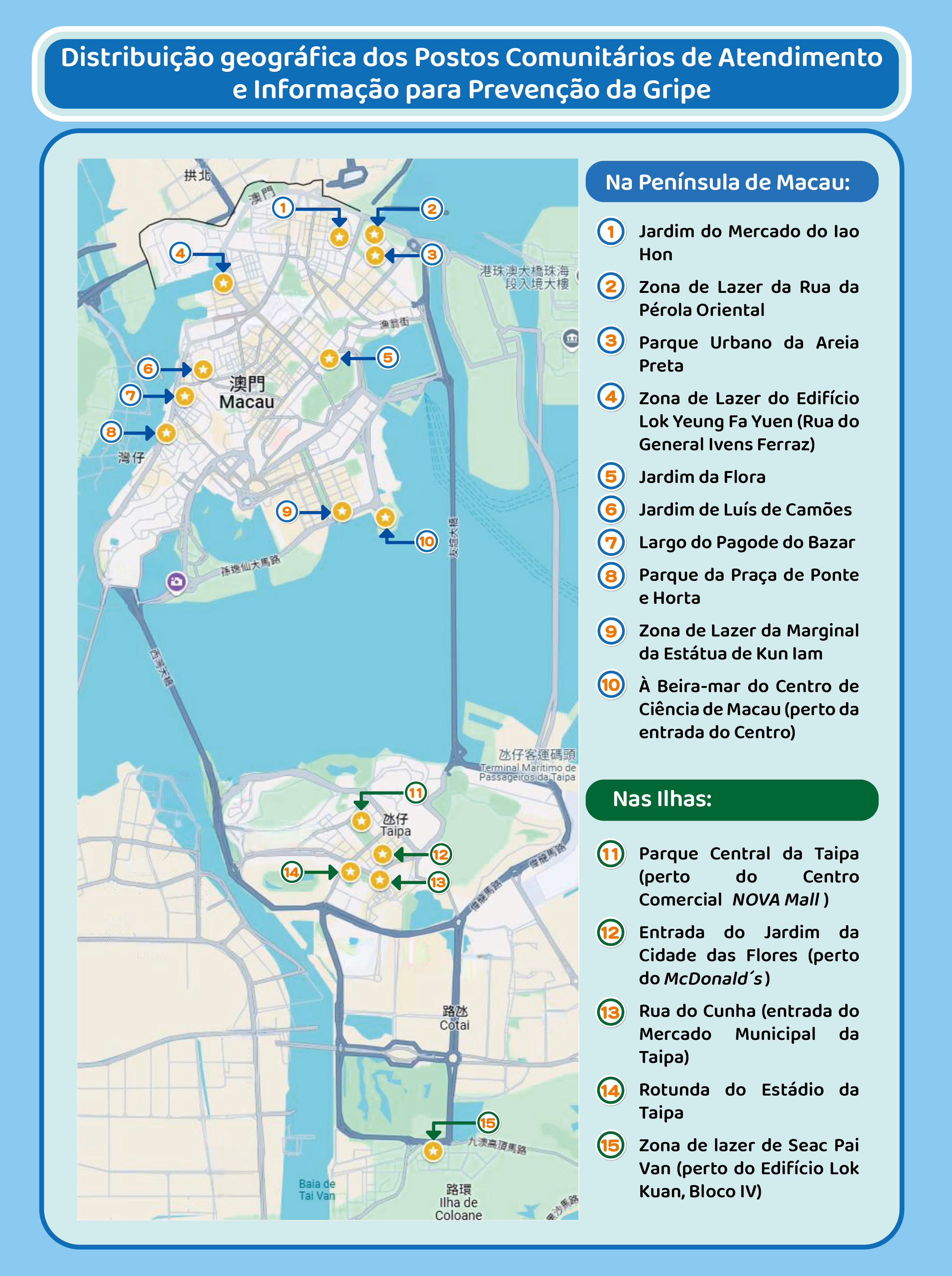 Macau já entrou no período de pico da gripe e prevê-se que o vírus da gripe se mantenha activo até Fevereiro. Em resposta ao pico da gripe e ao aumento de risco de propagação do vírus devido às viagens e às actividades de convívio frequentes dos residentes durante os feriados do Ano Novo Lunar, os Serviços de Saúde, em colaboração com as associações sociais e instituições de saúde, irão instalar, no próximo fim-de-semana (dias 18 e 19 de Janeiro), 15 Postos Comunitários de Atendimento e Informação para Prevenção da Gripe (os Postos Comunitários) em todas as zonas de Macau, com vista a reforçar a sensibilização e educação, bem como aumentar a consciencialização dos residentes sobre prevenção da gripe.