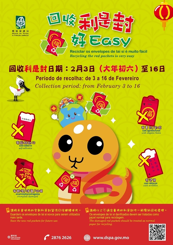 Os envelopes de “lai si” usados encontram-se disponíveis em 56 pontos, distribuídos pelos seguintes locais: DSPA, Centros Ambientais Alegria, União Geral das Associações dos Moradores de Macau, FAOM, Associação Geral das Mulheres de Macau, Aliança de Povo de Instituição de Macau, Cáritas de Macau, Associação de Nova Juventude Chinesa de Macau, Associação de Reabilitação Fu Hong de Macau e Macao Association of Social and Livelihood Enhancement. No período compreendido entre o dia 3 (sexto dia do primeiro mês lunar) e o dia 16 de Fevereiro de 2024 continuarão a estar disponíveis os pontos de recolha de envelopes de “lai si”, estabelecidos em cooperação entre a DSPA e os serviços públicos, associações, hotéis, bancos, escolas, estabelecimentos comerciais e edifícios habitacionais, entre outros. Para mais informações consulte, por favor, a página electrónica da DSPA http://www.dspa.gov.mo/redpacketrecycling.aspx.