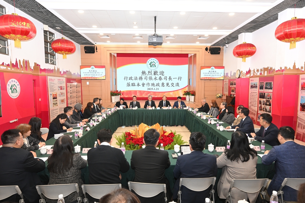 O secretário para a Administração e Justiça, André Cheong, visitou, esta tarde (21 de Janeiro), a Associação Geral dos Chineses Ultramarinos de Macau, onde foi realizada uma palestra, com o intuito de auscultar opiniões e sugestões no âmbito das linhas de acção governativa da área da administração e justiça para o corrente ano.