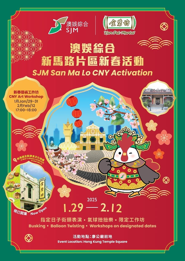 De 29 de Janeiro a 12 de Fevereiro, a SJM Resorts, S.A. irá organizar um conjunto de actividades emocionantes na zona da Avenida de Almeida Ribeiro, incluindo espectáculos de rua no Largo do Pagode do Bazar. Serão também realizados workshops de escrita de dísticos do Ano Novo Lunar e pintura de sacos de presentes em datas designadas, em colaboração com a Associação de Arte Juvenil de Macau. Além disso, o edifício patrimonial revitalizado “Mercado Kam Pek” reúne vários restaurantes de pequena e média dimensão, cujo restaurantes no primeiro andar entraram em funcionamento a partir de 25 de Janeiro, juntamente com os oito restaurantes abertos anteriormente, apresentando especialidades chinesas, portuguesas, japonesas, tailandesas e taiwanesas. Durante o festival, haverá espectáculos de música e escrita de dísticos do Ano Novo Lunar. A parede exterior será decorada com lanternas do Ano Novo Chinês, injectando mais vitalidade e encanto na Avenida de Almeida Ribeiro e demonstrando a atmosfera festiva e criativa única da zona.