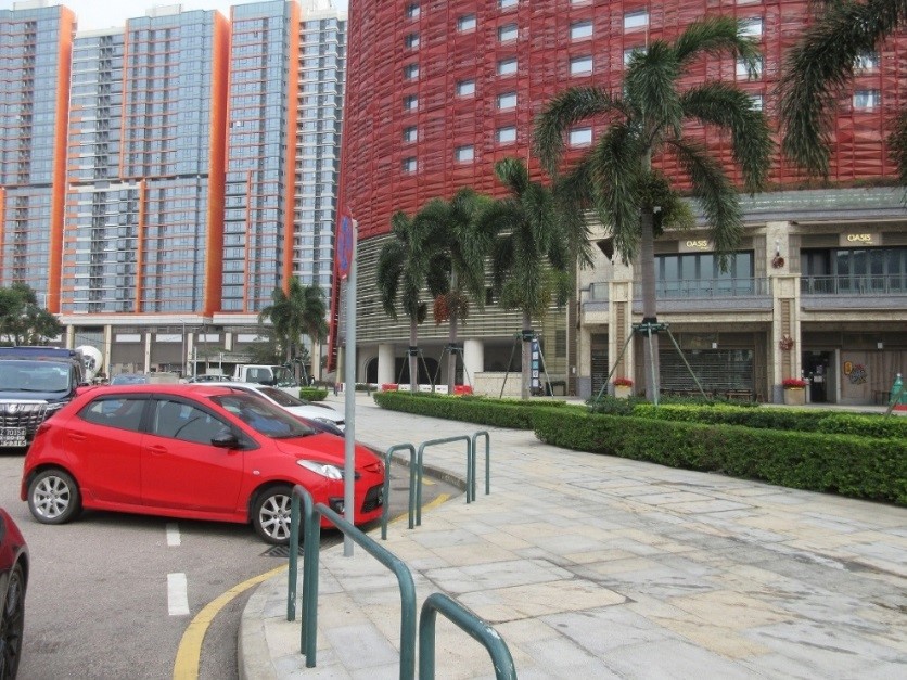 Rua das Árvores do Pagode, zona de carga-descarga e tomada-largada de passageiros junto ao Centro Comercial The Veranda (perto do edifício residencial One Oasis) |