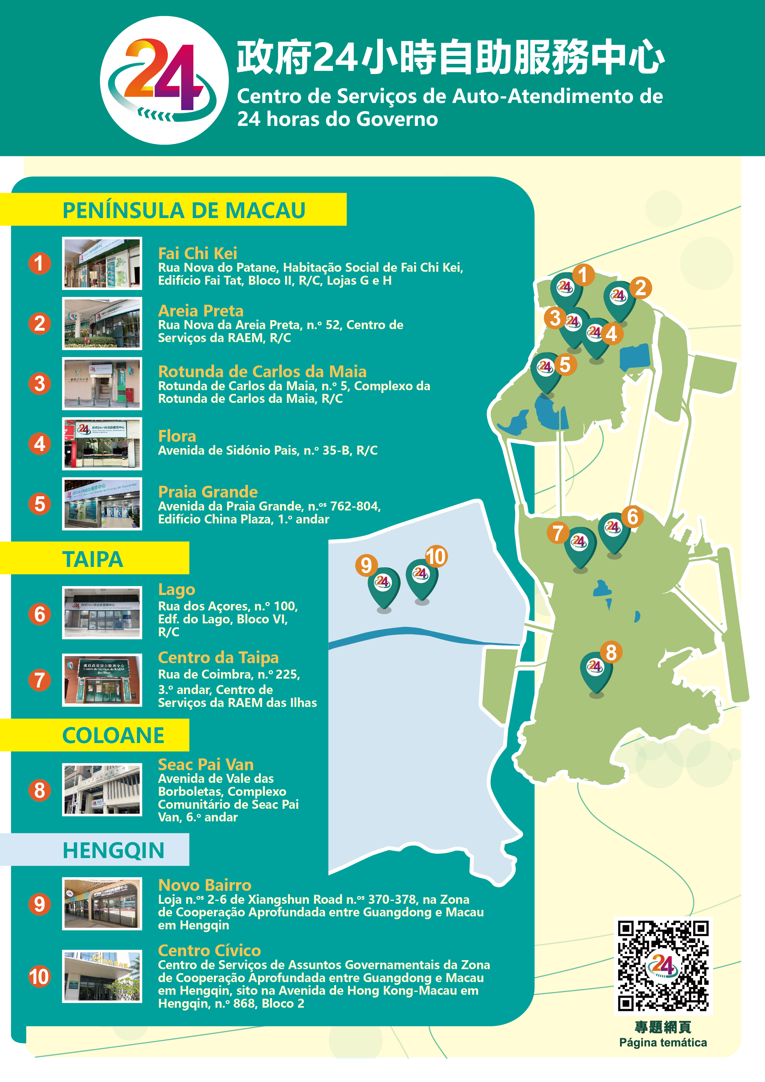 O Centro de Serviços de Auto-Atendimento de 24 horas do Governo do Complexo da Rotunda de Carlos da Maia situa-se na Rotunda de Carlos da Maia, n.o 5, Complexo da Rotunda de Carlos da Maia, R/C, Macau. Para mais informações, pode-se consultar a página temática electrónica www.dsi.gov.mo/eservice. Em caso de dúvida, pode-se ligar para a linha aberta da DSI 2837-0777 ou 2837-0888.