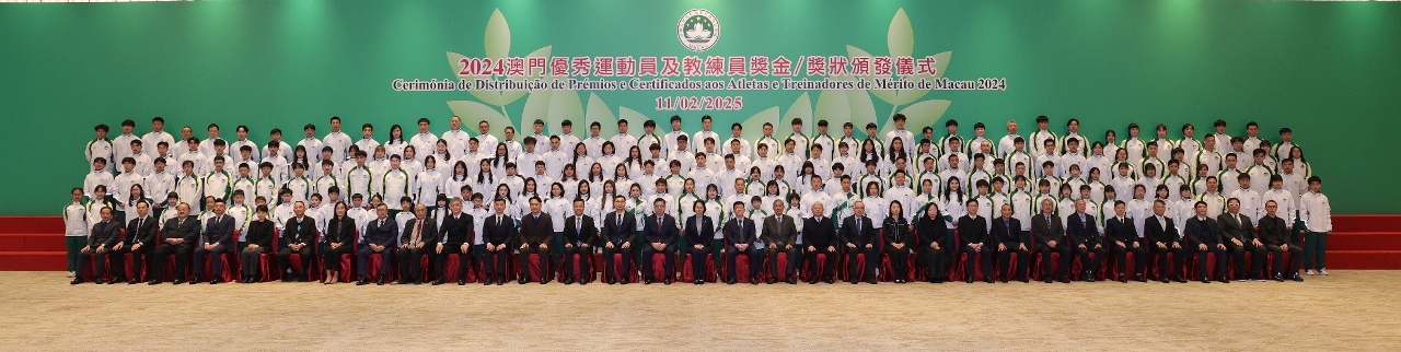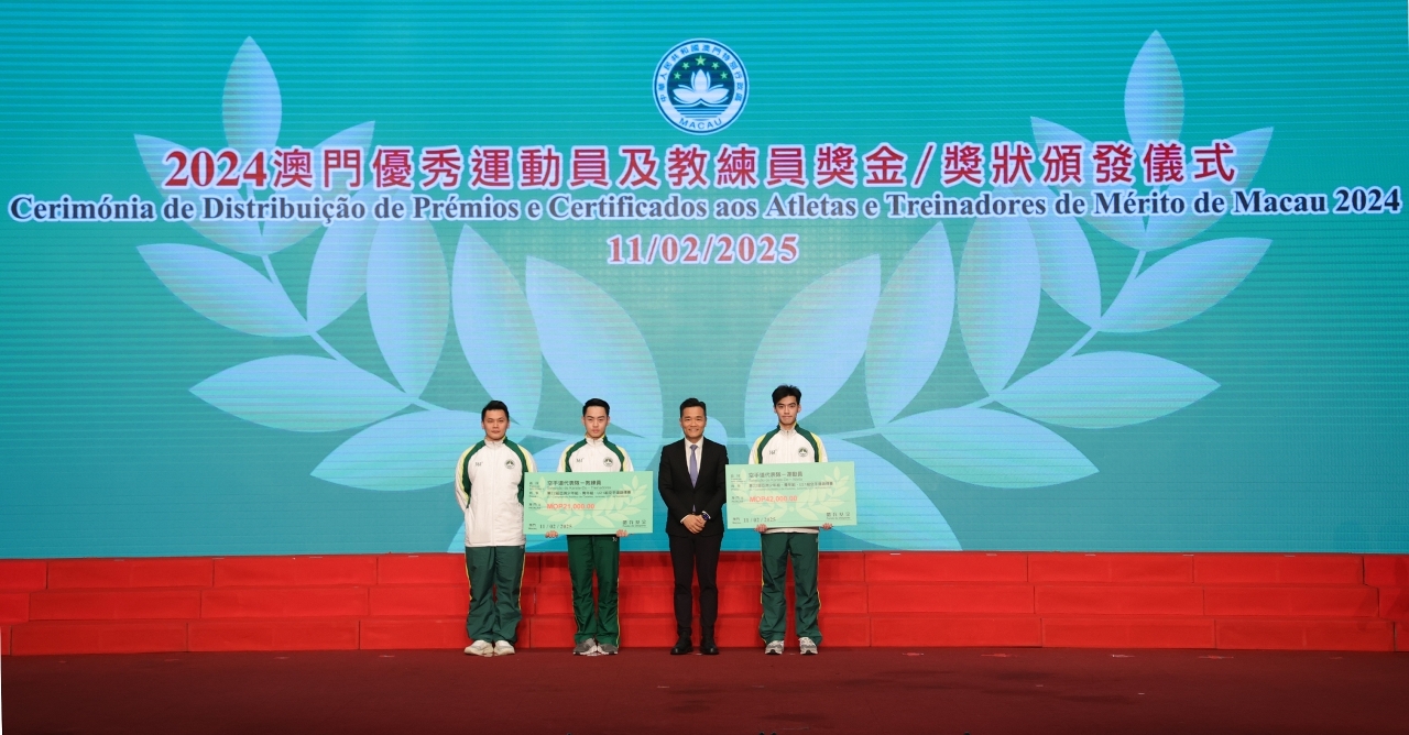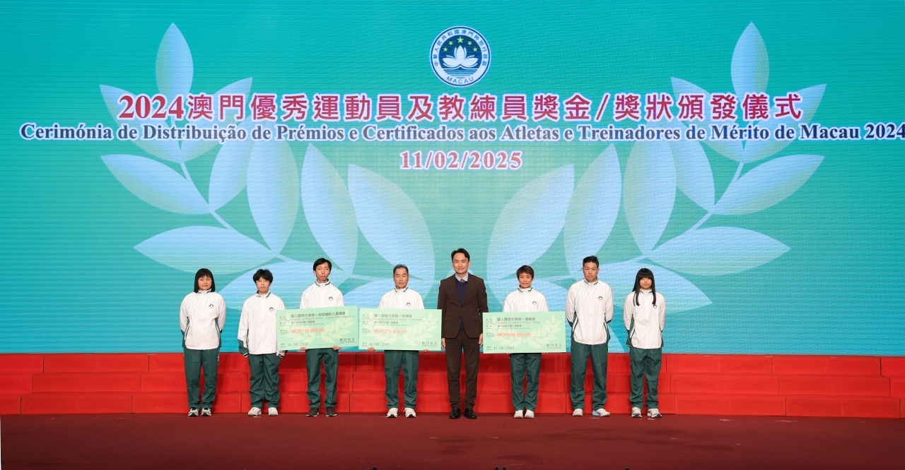 Em reconhecimento dos atletas, treinadores e pessoal de apoio técnico que alcançaram excelentes resultados nos eventos desportivos em 2024, teve lugar hoje (dia 11), às 19H30, a Cerimónia de Distribuição de Prémios e Certificados aos Atletas e Treinadores de Mérito de Macau 2024, com a participação da Secretária para os Assuntos Sociais e Cultura do Governo da Região Administrativa Especial de Macau, O Lam, e de outros convidados, que apresentaram felicitações às equipas premiadas.