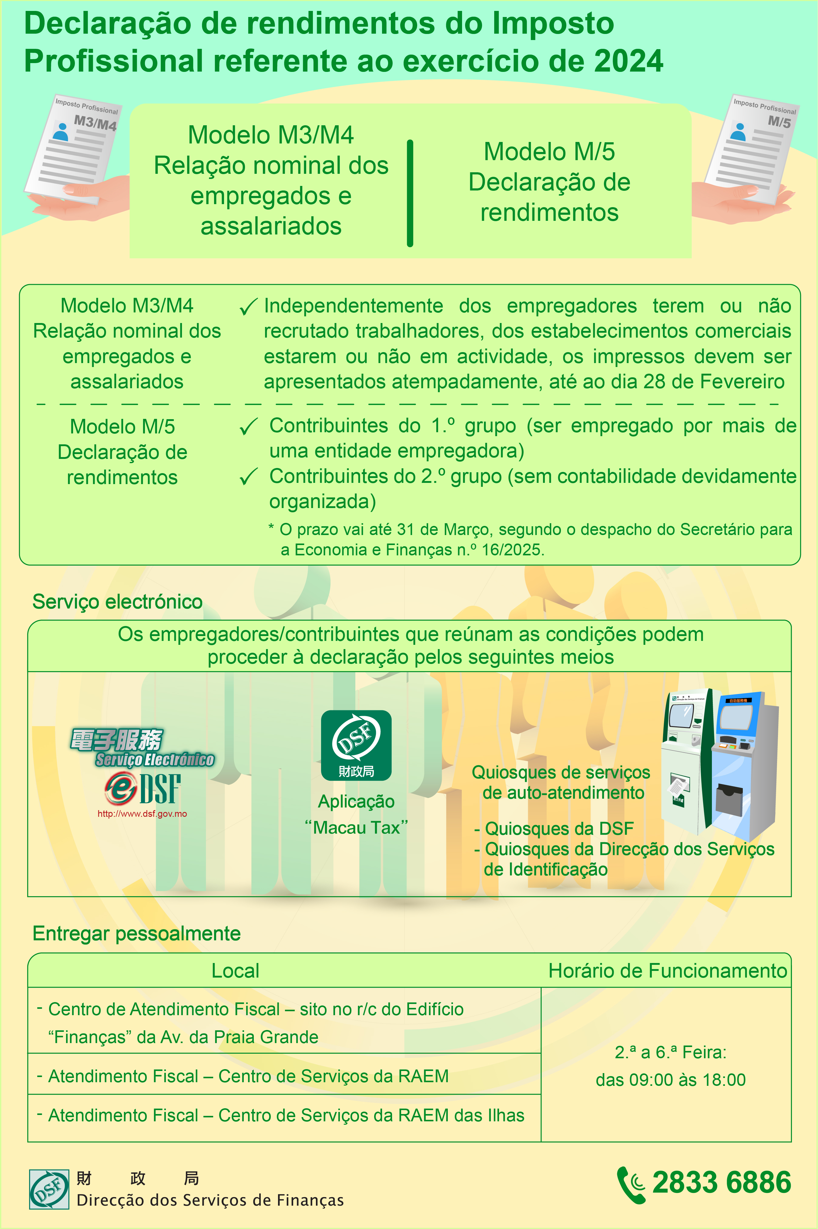 Nos termos do artigo 13.º do Regulamento do Imposto Profissional, aprovado pela Lei n.º 2/78/M, o prazo limite para a entrega do modelo M3/M4 do Imposto Profissional do 1.º Grupo (relação nominal dos empregados e assalariados) referente ao exercício de 2024 vai até 28 de Fevereiro. Além disso, conforme o despacho do Secretário para a Economia e Finanças n.º 16/2025, para os contribuintes do 1.º Grupo do Imposto Profissional cujos rendimentos provenham de mais de uma entidade empregadora, bem como, para os contribuintes do 2.º Grupo do Imposto Profissional sem contabilidade devidamente organizada, o prazo de entrega da declaração de rendimentos modelo M/5 do Imposto Profissional referente ao exercício de 2024, vai até 31 de Março.