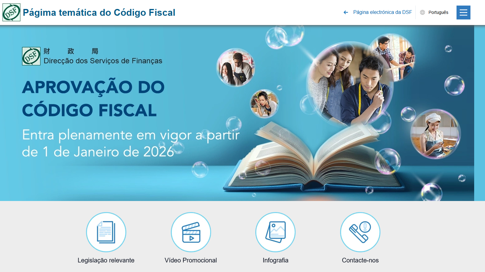 A “Página Temática do Código Fiscal” contêm o teor da legislação do Código Fiscal, os vídeos promocionais, as últimas notícias, a infografia, as informações sobre as actividades, as informações de consulta e de contacto, entre outros, que estão disponibilizados em chinês tradicional, chinês simplificado e em português, sendo o conteúdo da página temática optimizado continuamente pela DSF.