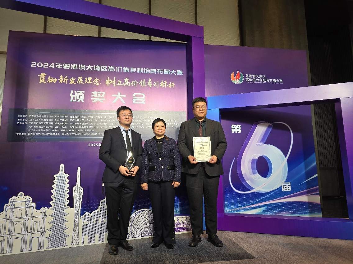 A cerimónia de entrega de prémios do Concurso para o Esquema da Formação de Patentes de Alto Valor da Grande Baía Guangdong-Hong Kong-Macau 2024 (Concurso) teve lugar na cidade de Jiangmen, a 25 de Fevereiro. Estiveram presentes na cerimónia a Inspectora de 1.ª classe da Administração de Regulação do Mercado da Província de Guangdong (Direcção da Propriedade Intelectual), Xie Hong, o Vice-Presidente do Governo Popular do Município de Jiangmen, Cao Yang, o Adjunto do Chefe do Departamento da Propriedade Intelectual do Governo da RAEHK, Lau Kwok Keung, e a Subdirectora da Direcção dos Serviços de Economia e Desenvolvimento Tecnológico (DSEDT) do Governo da RAEM, Chan Tze Wai, que proferiram discursos.