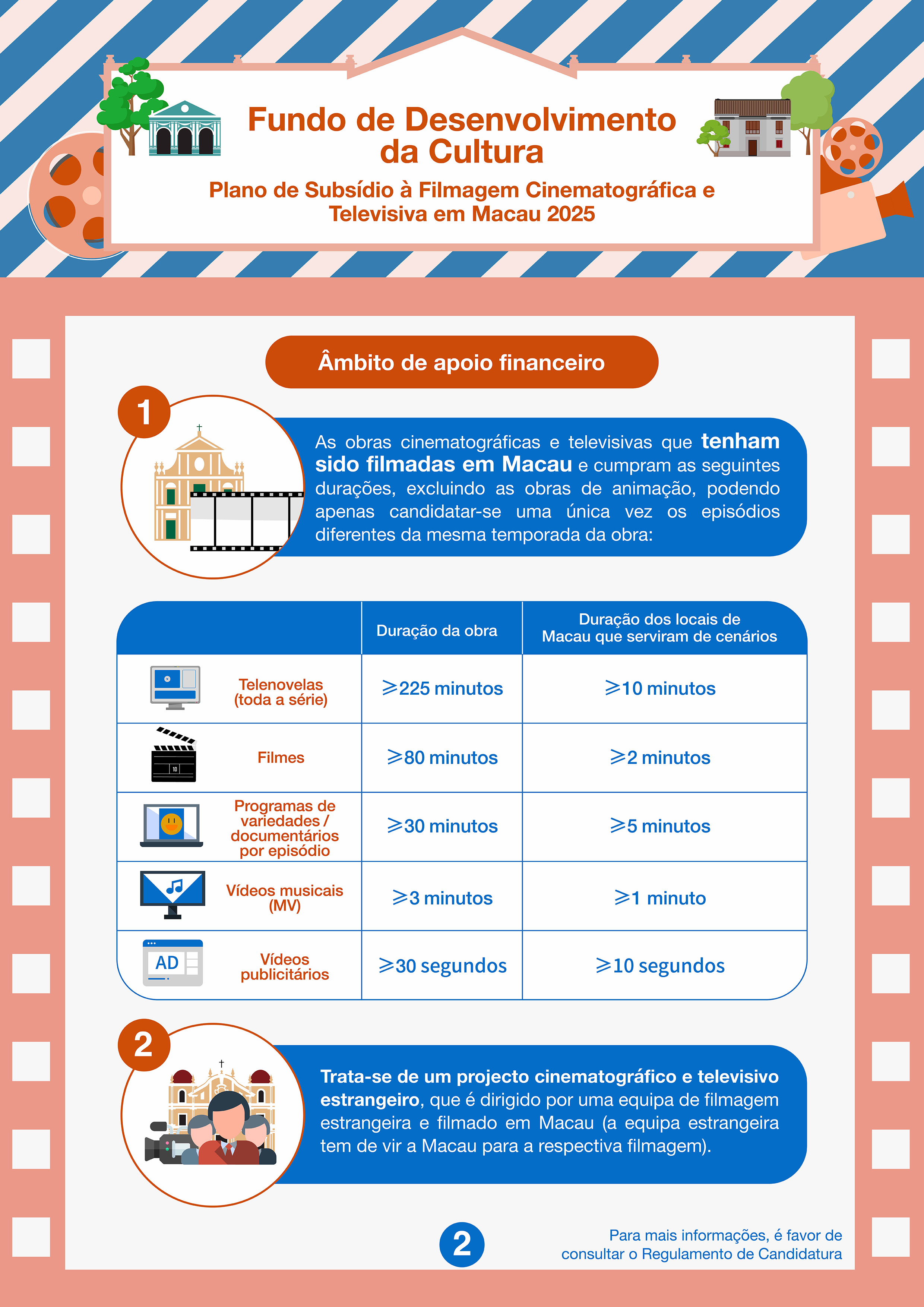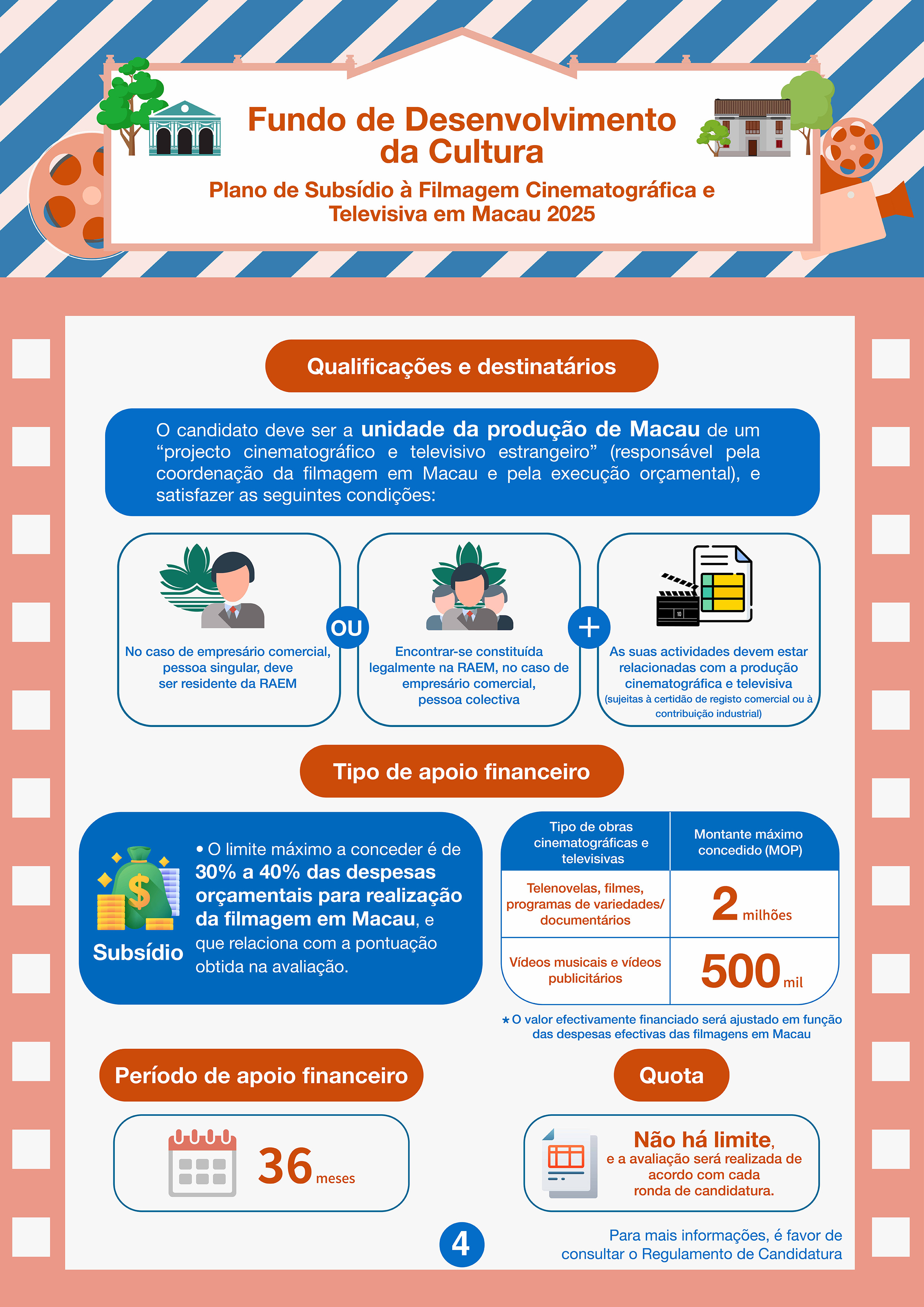 Este ano, serão lançadas quadro rondas de candidatura, com a primeira ronda de 28 de Fevereiro a 31 de Março de 2025. Se o orçamento deste Plano estiver esgotado, o período de candidatura terminará mais cedo. É aceite a candidatura do projecto cinematográfico e televisivo estrangeiro, que é dirigido por uma equipa de filmagem estrangeira, com filmagem em Macau não inferior a 3 dias, e que não foi dado início a qualquer parte da filmagem em Macau antes da data de apresentação confirmada de candidatura. As candidaturas devem ser apresentadas pelos empresários comerciais locais que sejam unidades de produção em Macau, cujas actividades devem estar relacionadas com a produção cinematográfica e televisiva. Dentro do período de apoio financeiro, a exibição pública do projecto financiado deve estar concluída, tendo em conta que a duração do mesmo e dos locais de Macau que serviram de cenários do filme devem estar em conformidade com os requisitos no Plano.