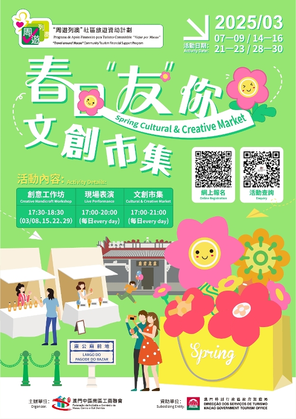 Através do seu programa de apoio financeiro, a Direcção dos Serviços de Turismo (DST) continua a incentivar as associações de Macau a realizarem actividades ou projectos turísticos diversificados, com vista a impulsionar a economia comunitária. Entre as iniciativas subsidiadas em Março há experiências centradas na gastronomia, incluindo “Embark on a Gastronomic Journey with Master Chef: Exploring Flavors at Local Markets”, “Spring Cultural & Creative Market”, “Historical and Nostalgic Walk in Coloane”, “So Yummy! Macao Local Cuisine Experience”, “Happy Macao Tour 7” e “Macanese Cooking Experience”, para dar a sentir aos residentes e visitantes a atracção da diversidade do “turismo+” de Macau.