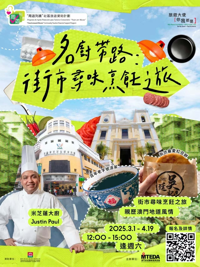 Todos os sábados, entre 1 de Março e 19 de Abril, o chef Michelin, Justin Paul, conduzirá visitas para comprar ingredientes em mercados locais e cozinhar com os participantes iguarias típicas de Macau. Durante o passeio haverá oportunidade para saborear o tradicional bolo de feijão vermelho e desfrutar de chá de ervas numa loja centenária, sentir o ambiente característico e o património cultural intangível de Macau.