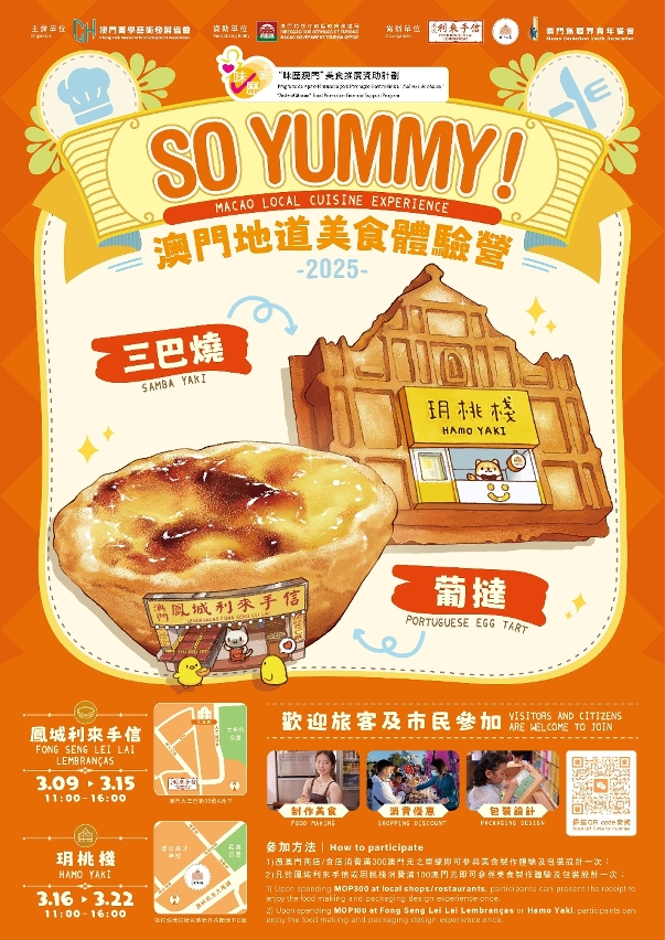 A actividade “So Yummy! Macao Local Cuisine Experience”, realizada em cooperação com a Fong Seng Lei Lai Lembranças e a Hamo Yaki, permitirá aos participantes realizar entre 9 e 22 de Março nestes dois estabelecimentos de iguarias de Macau a confecção e desenho da embalagem de pastéis de nata e sanbayaki, para uma memória de passeio singular na cidade.
