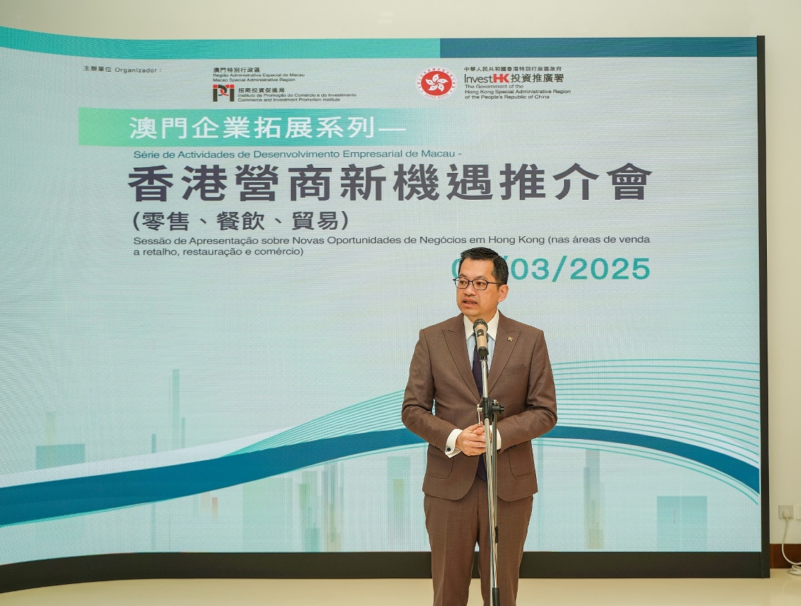 Tendo em vista impulsionar o intercâmbio e a cooperação de investimentos bilaterais entre empresas de Hong Kong e Macau, o Instituto de Promoção do Comércio e do Investimento da Região Administrativa Especial de Macau (IPIM) e o Departamento de Promoção de Investimento do Governo da Região Administrativa Especial de Hong Kong (InvestHK) co-organizaram hoje (dia 6) em Macau o evento “Série de Expansão Empresarail de Macau – Sessão de Promoção de Novas Oportunidades de Negócio de Hong Kong (Comércio a Retalho, Restauração, Comércio)”. Cerca de 90 representantes de empresas, associações/câmaras comerciais de produtos de fabricados em Macau, marcas de Macau, comércio a retalho, restauração e importação e exportação participaram, tendo o InvestHK e as empresas de Macau que investem em Hong Kong partilhado a situação actual dos negócios em Hong Kong. Este evento tem como objectivo ajudar as empresas a explorar mais oportunidades de cooperação entre Hong Kong e Macau, bem como oportunidades de desenvolvimento no mercado da Grande Baía.