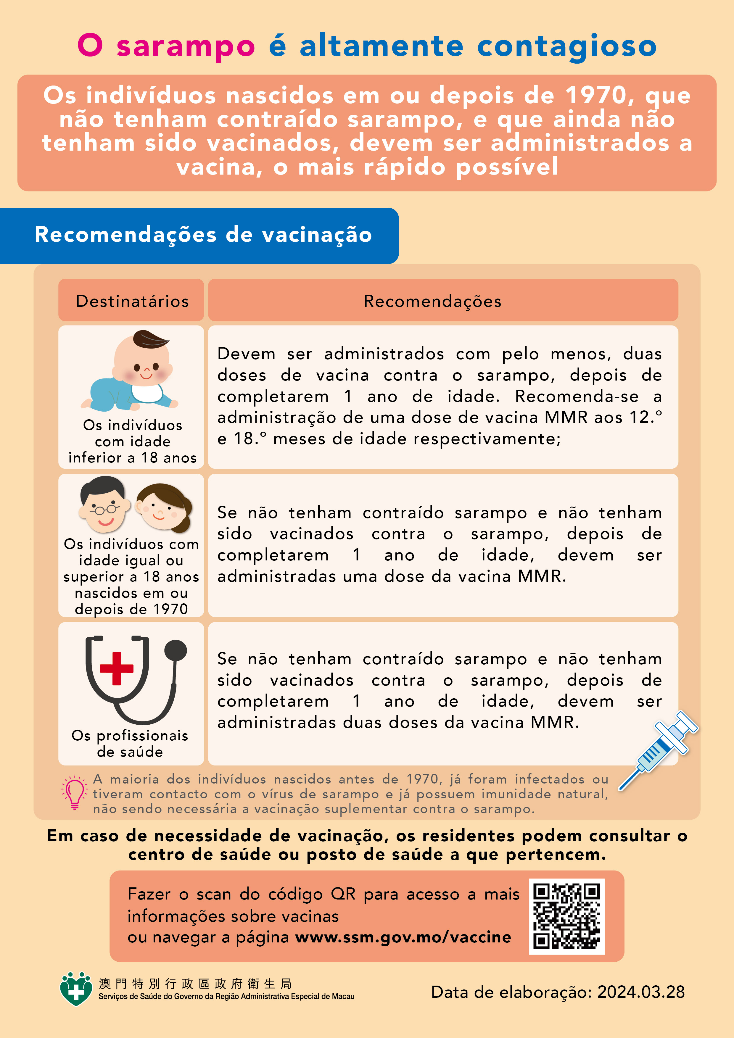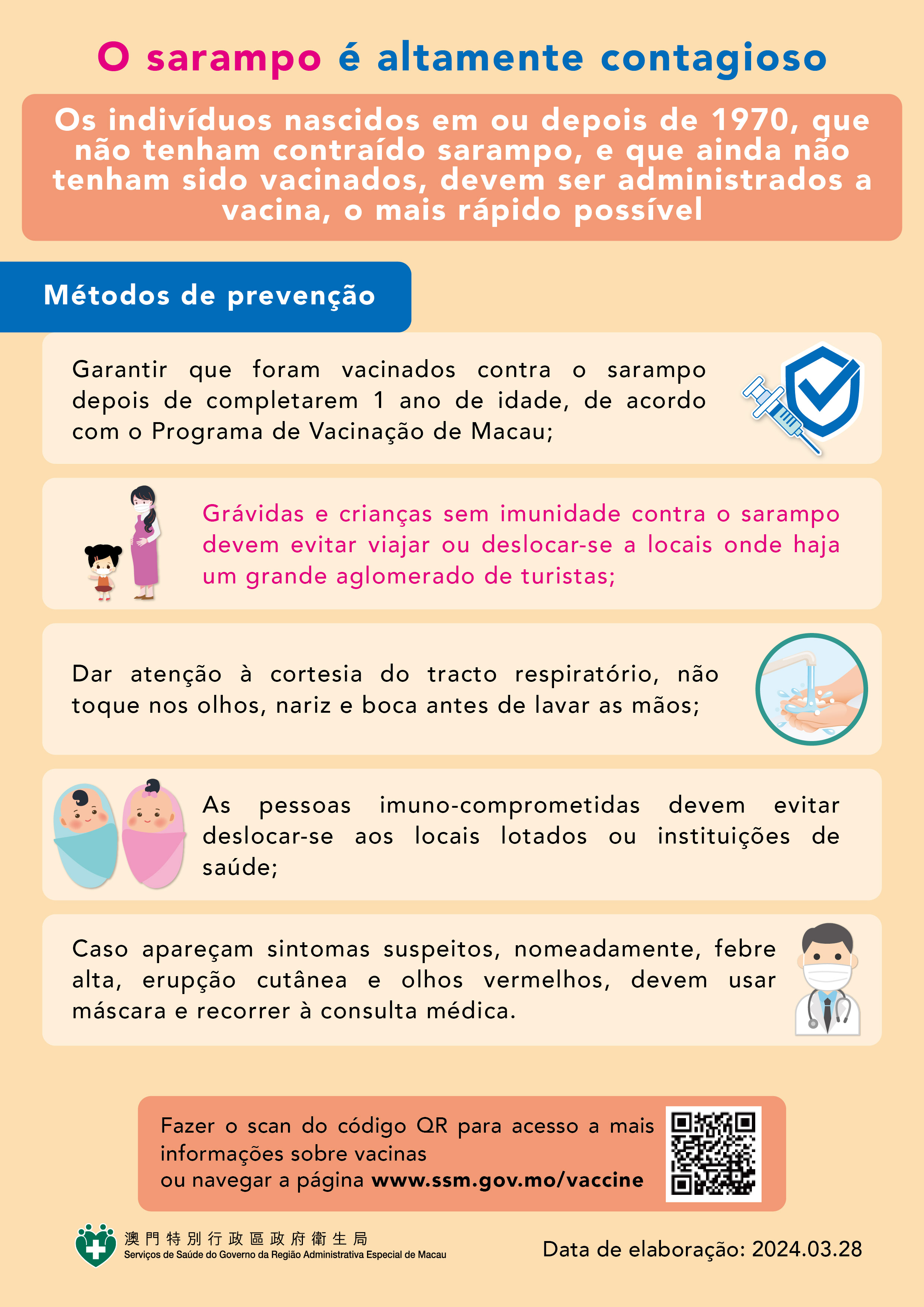 O sarampo é altamente contagioso, e indivíduos não vacinados ou que nunca foram infectados são facilmente infectados. A vacinação contra o sarampo é a forma mais eficaz de prevenir a infecção e reduzir o risco de propagação do sarampo. Os Serviços de Saúde apelam aos residentes nascidos em ou depois de 1970, que não possuam imunidade contra o sarampo, que assegurem a conclusão da vacinação contra o sarampo antes de se deslocarem às áreas afectadas. Os residentes podem consultar o registo individual de vacinação na conta única de acesso comum (Minha saúde → Registo de saúde → Registo de vacinação), bem como contactar o centro de saúde ou posto de saúde a que pertencem para obter informações.