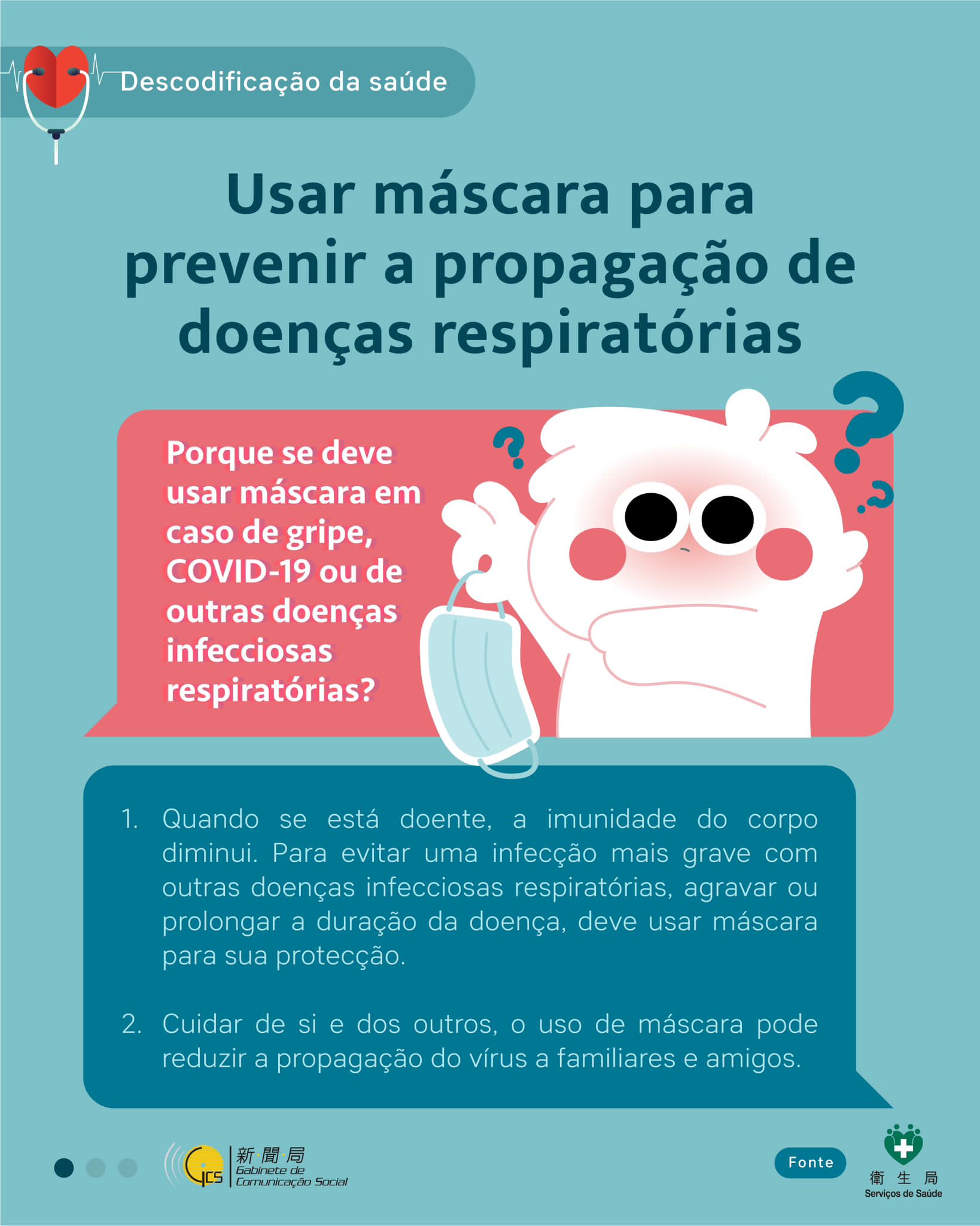 Com vista a diminuir a infecção da gripe, da COVID-19 e de outras doenças transmissíveis do tracto respiratório superior, os Serviços de Saúde pretendem sensibilizar, mais uma vez, os residentes para adopção das seguintes medidas de prevenção: