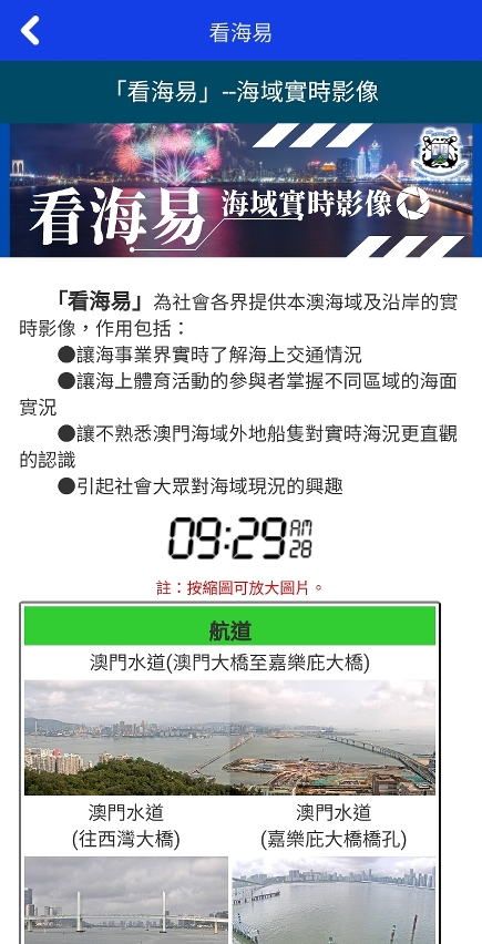 A DSAMA lançou, em Junho de 2022, o projecto “Mar”, com o objectivo de transmitir ao público imagens de câmaras ao vivo do mar, permitindo aos cidadãos e ao sector marítimo conhecer as condições reais das áreas marítimas de Macau, bem como o ponto de situação dos canais de Macau, do fundeadouro do Porto Interior e de outras zonas onde as embarcações navegam e atracam com maior frequência. Para reforçar a monitorização das áreas marítimas de Macau e permitir que o público conheça melhor o ponto de situação das áreas marítimas de Macau, a DSAMA acrescentou recentemente 4 ângulos de observação para o “Mar”, disponibilizando ao público um total de 18 ângulos de observação diferentes, alguns dos quais permitem a apreciação duma paisagem magnífica das áreas marítimas de Macau em diferentes momentos, incluindo a Ponte Sai Van ao anoitecer, a Ponte Macau, o Canal de Macau, as bacias dos terminais marítimos, entre outros.