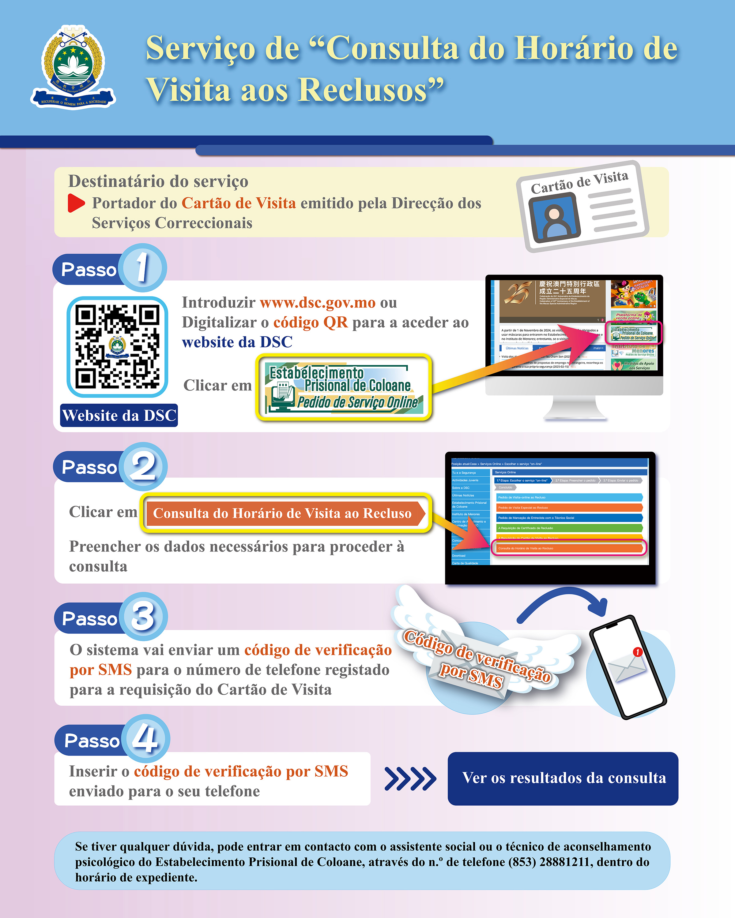Para articular com o desenvolvimento de governação electrónica do Governo da Região Administrativa Especial de Macau e aperfeiçoar constantemente vários serviços convenientes, a Direcção dos Serviços Correccionais (DSC) disponibiliza, desde 31 de Março de 2025, a funcionalidade “Consulta do Horário de Visita aos Reclusos” na plataforma de serviços online. Para consultar o horário de visita aos reclusos, o portador do cartão de visita pode aceder ao serviço de pedidos online do Estabelecimento Prisional de Coloane da DSC, em https://www.dsc.gov.mo/sitepo/web_opinion.aspx, inserindo e fornecendo as respectivas informações conforme solicitado.