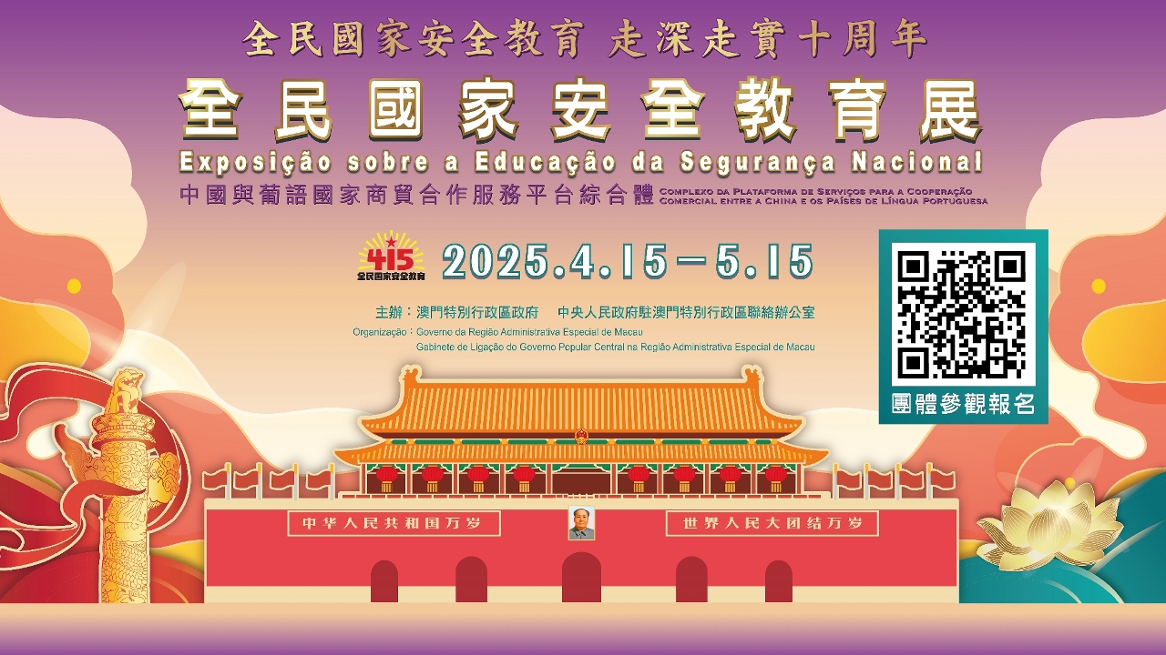 O Governo da Região Administrativa Especial de Macau e o Gabinete de Ligação do Governo Popular Central na RAEM organizam conjuntamente pela oitava vez consecutiva, a «Exposição sobre a Educação da Segurança Nacional», que se realizará no período de 15 de Abril a 15 de Maio, no Complexo da Plataforma de Serviços para a Cooperação Comercial entre a China e os Países de Língua Portuguesa, situado na Avenida Dr. Sun Yat-Sen. A inscrição online para grupos e marcação de visita guiada já se encontra disponível no site temático sendo bem-vindos todos os cidadãos.
