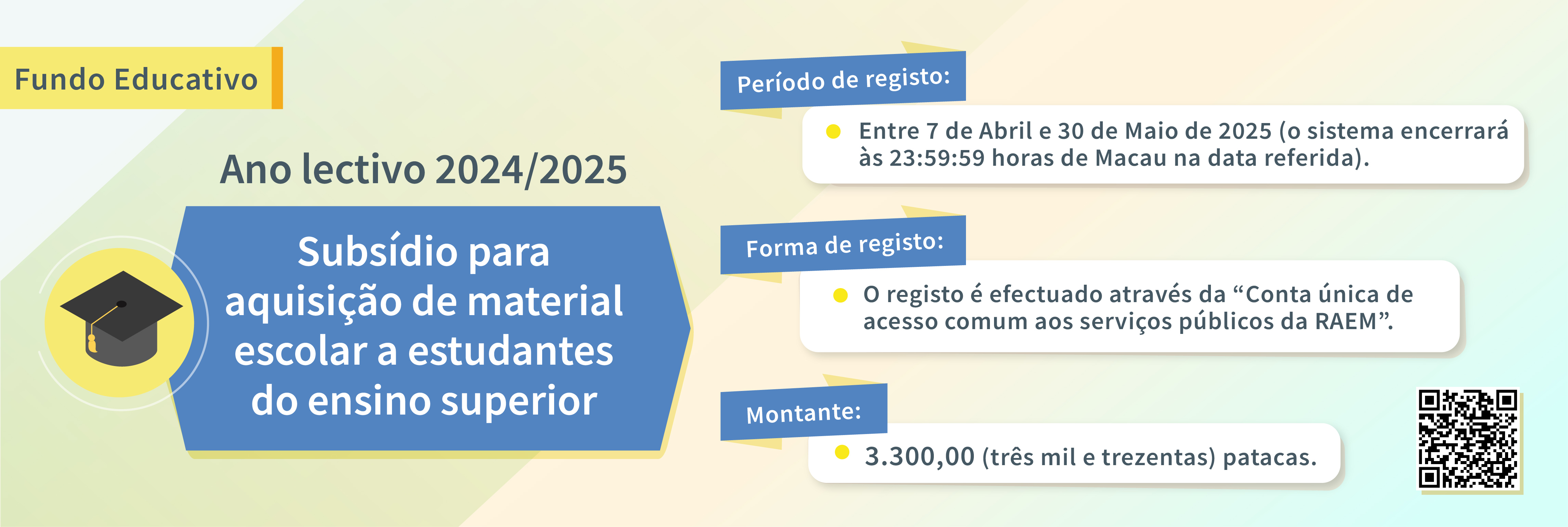 O Fundo Educativo vai dar início, entre 7 de Abril e 30 de Maio de 2025, à fase de registo para atribuição do “Subsídio para aquisição de material escolar a estudantes do ensino superior no ano lectivo de 2024/2025”, no valor de três mil e trezentas patacas, a estudantes do ensino superior que reúnam os requisitos para a atribuição.