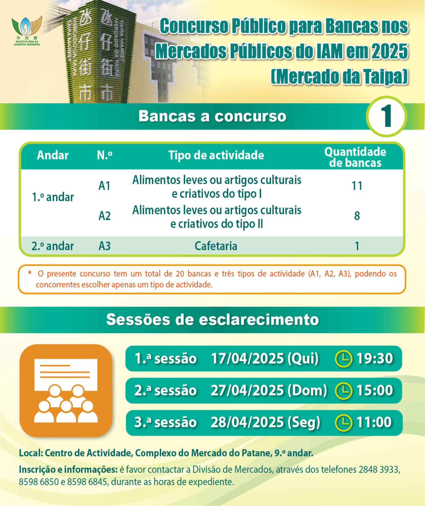 A fim de permitir aos concorrentes interessados melhor conhecerem os respectivos procedimentos, preencherem correctamente o boletim de candidatura do concurso público e elaborarem a proposta para concurso em conformidade com as observações, o IAM irá realizar três sessões de esclarecimento sobre o concurso público, no dia 17 de Abril, pelas 19h30, no dia 27 de Abril, pelas 15h00, e no dia 28 de Abril, pelas 11h00, no Centro de Actividades do Patane. Os residentes podem inscrever-se e obter mais informações através dos números da Divisão de Mercados: 28483933, 85986850 e 85986845. Além disso, podem consultar a página do concurso público de bancas dos mercados públicos do IAM (https://go.iam.gov.mo/fwlink/concursomercado), para obter mais informações.