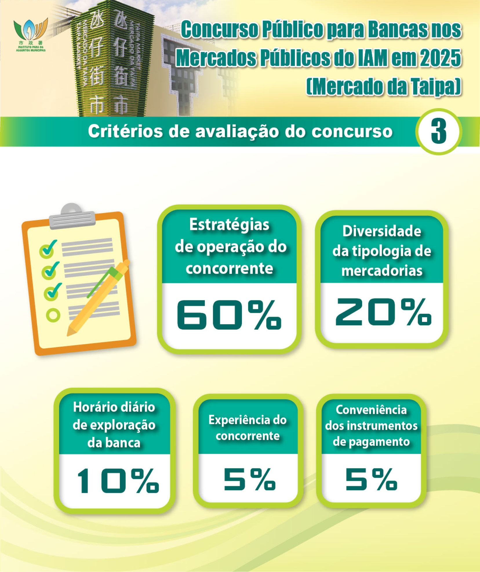 Tem início hoje (dia 9) o concurso público para as 20 bancas de alimentos leves, artigos culturais e criativos e cafeteria do Mercado da Taipa. O Instituto para os Assuntos Municipais (IAM) irá efectuar a apreciação de acordo com cinco critérios de avaliação, nomeadamente, a estratégias de operação do concorrente, a experiência e as qualificações do concorrente, o horário diário de exploração da banca, a diversidade da tipologia de mercadorias e a conveniência dos instrumentos de pagamento. Os interessados podem entregar, a partir de hoje e até às 13h00 do dia 23 de Maio, o boletim de candidatura e a proposta para concurso, entre outros documentos. O IAM irá realizar, no corrente mês, três sessões de esclarecimento sobre o concurso público, no Centro de Actividades do Patane, e todos os residentes são bem-vindos a participar.