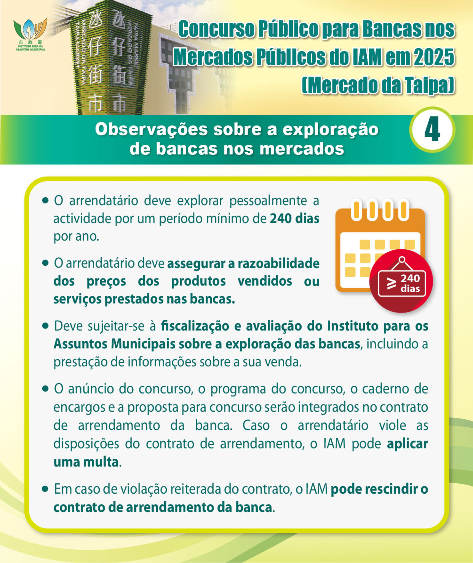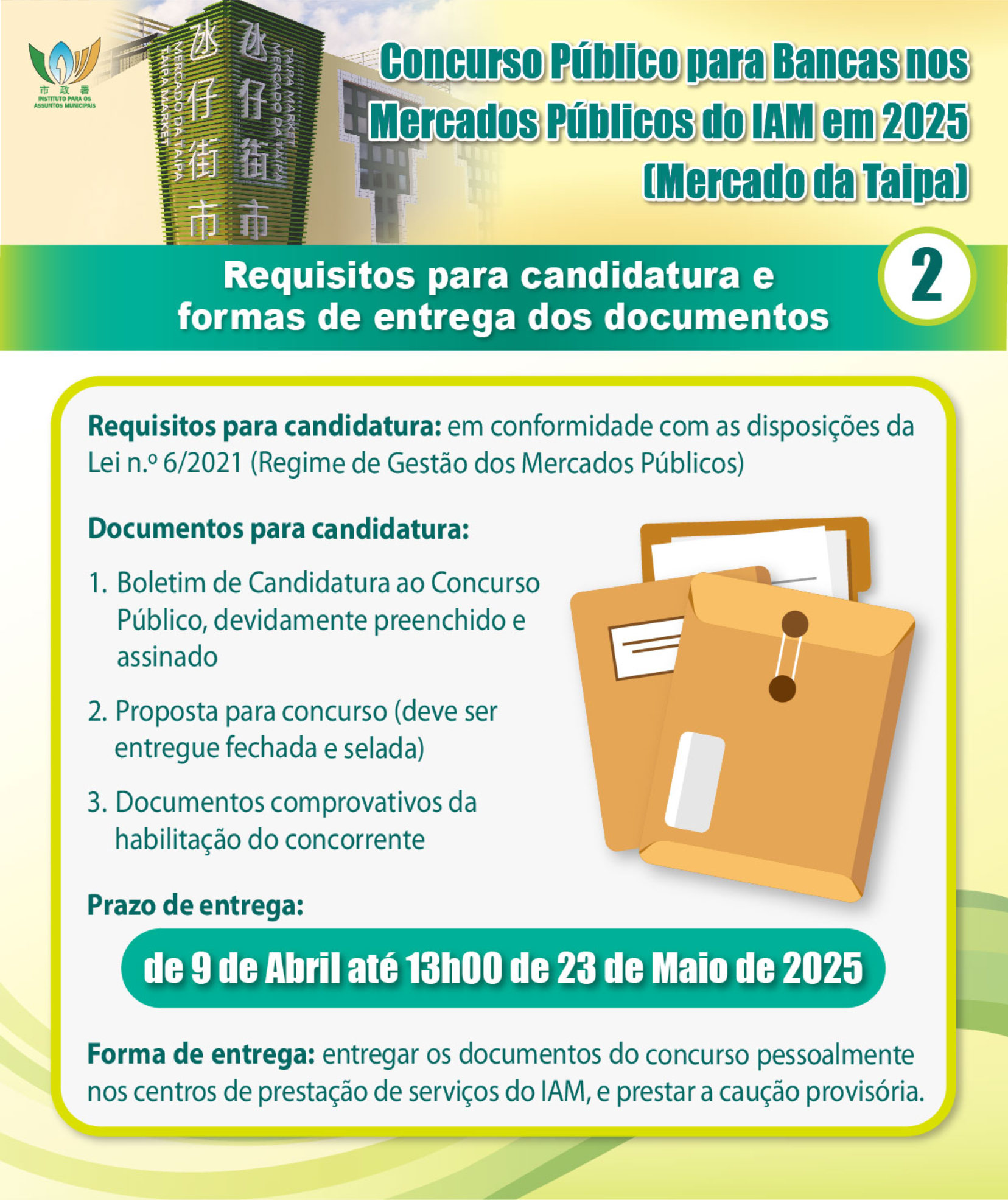 De acordo com o Regime de Gestão dos Mercados Públicos, o concurso público destina-se à angariação de arrendatários de bancas, podendo os interessados elaborar propostas de acordo com a sua vontade. As candidaturas devem satisfazer os respectivos requisitos e qualificações, sendo que cada concorrente só pode apresentar um boletim de candidatura e uma proposta para concurso. Os interessados podem, a partir de hoje e até às 13h00 do dia 23 de Maio, dirigir-se pessoalmente aos Centros de Prestação de Serviços do IAM para entregar o boletim de candidatura e a proposta para concurso, bem como prestar uma caução provisória.