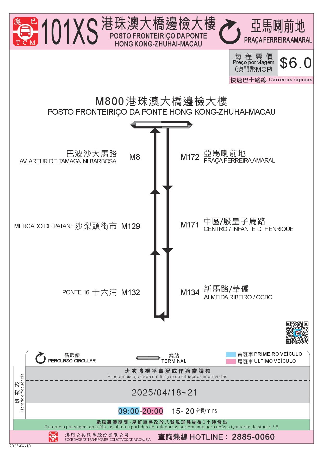 Alargamento provisorio da zona de fila de espera no Posto Fronteiriço de Macau da Ponte Hong Kong-Zhuhai-Macau, com suspensão temporária da carreira conjunta das empresas integradas de turismo e lazer da Ponte Hong Kong-Zhuhai-Macau (autocarro branco - carreira do Terminal Marítimo do Porto Exterior), que será substituída por serviços ponto a ponto, operados individualmente por cada empresa integrada de turismo e lazer, conforme as suas necessidades. |