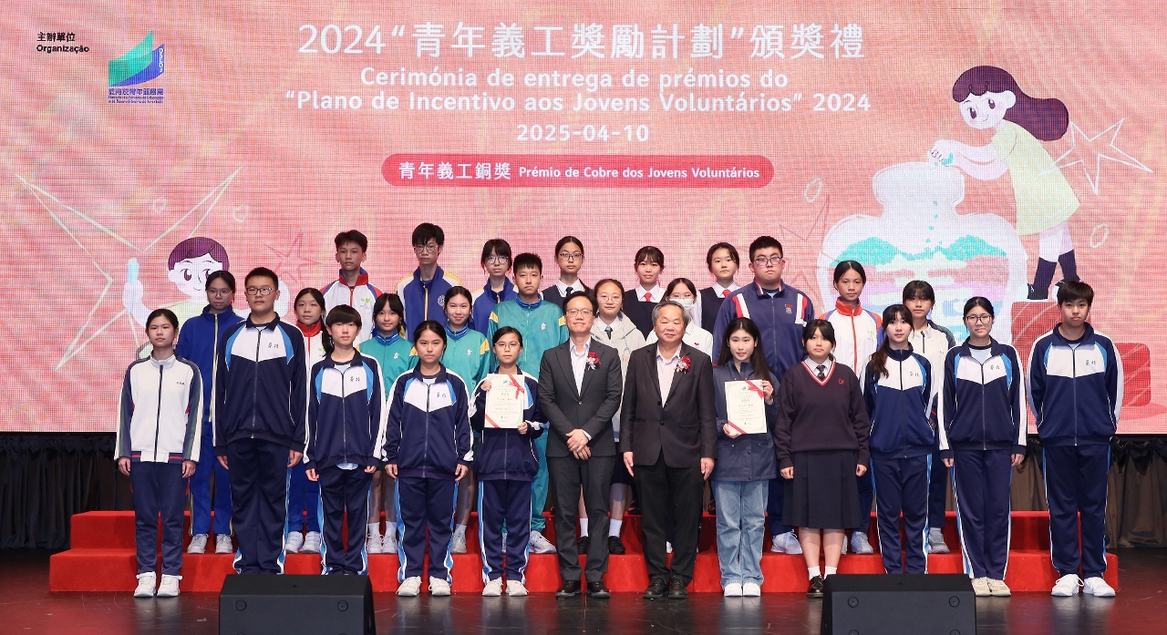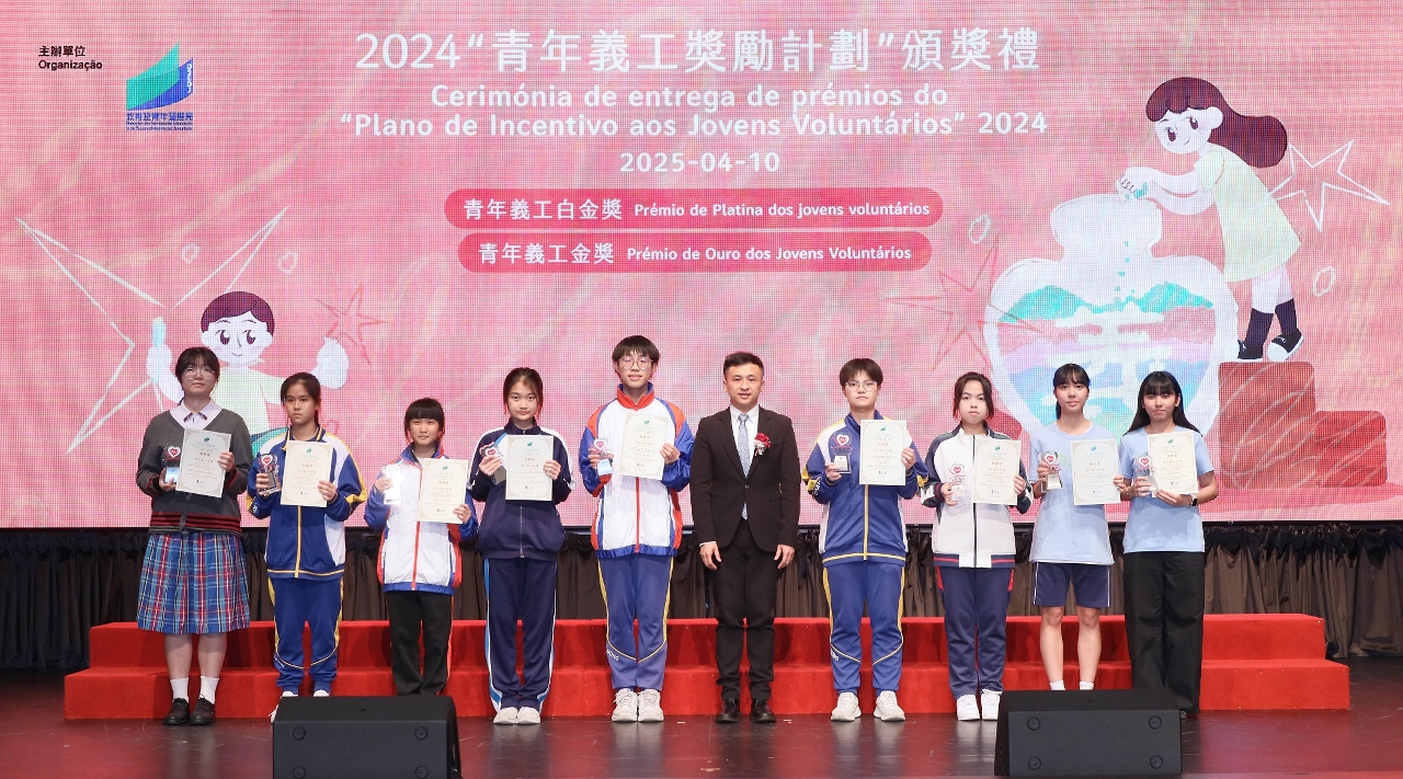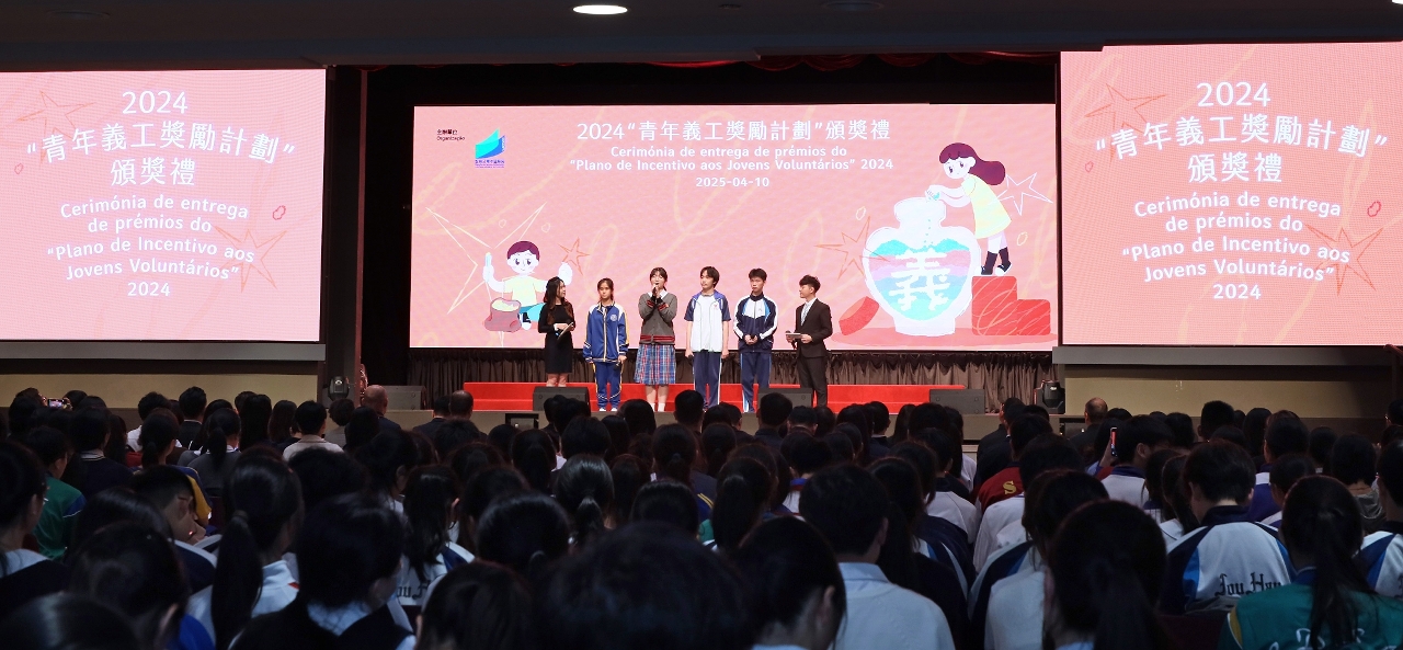 A fim de elogiar e reconhecer o contributo e o compromisso assumidos pelos jovens voluntários de Macau para com a sociedade ao longo do ano passado, a Direcção dos Serviços de Educação e de Desenvolvimento da Juventude (DSEDJ) organizou a cerimónia de entrega de prémios do “Plano de Incentivo aos Jovens Voluntários” de 2024, que teve lugar no dia 10 de Abril. Na cerimónia estiveram presentes mais de 450 pessoas, incluindo os Subdirectores da DSEDJ, Teng Sio Hong e Wong Ka Ki, vogais do Conselho de Juventude, representantes de serviços públicos e instituições públicas participantes nos planos da DSEDJ para jovens voluntários, representantes de associações sociais, representantes de escolas e um grupo de jovens voluntários.