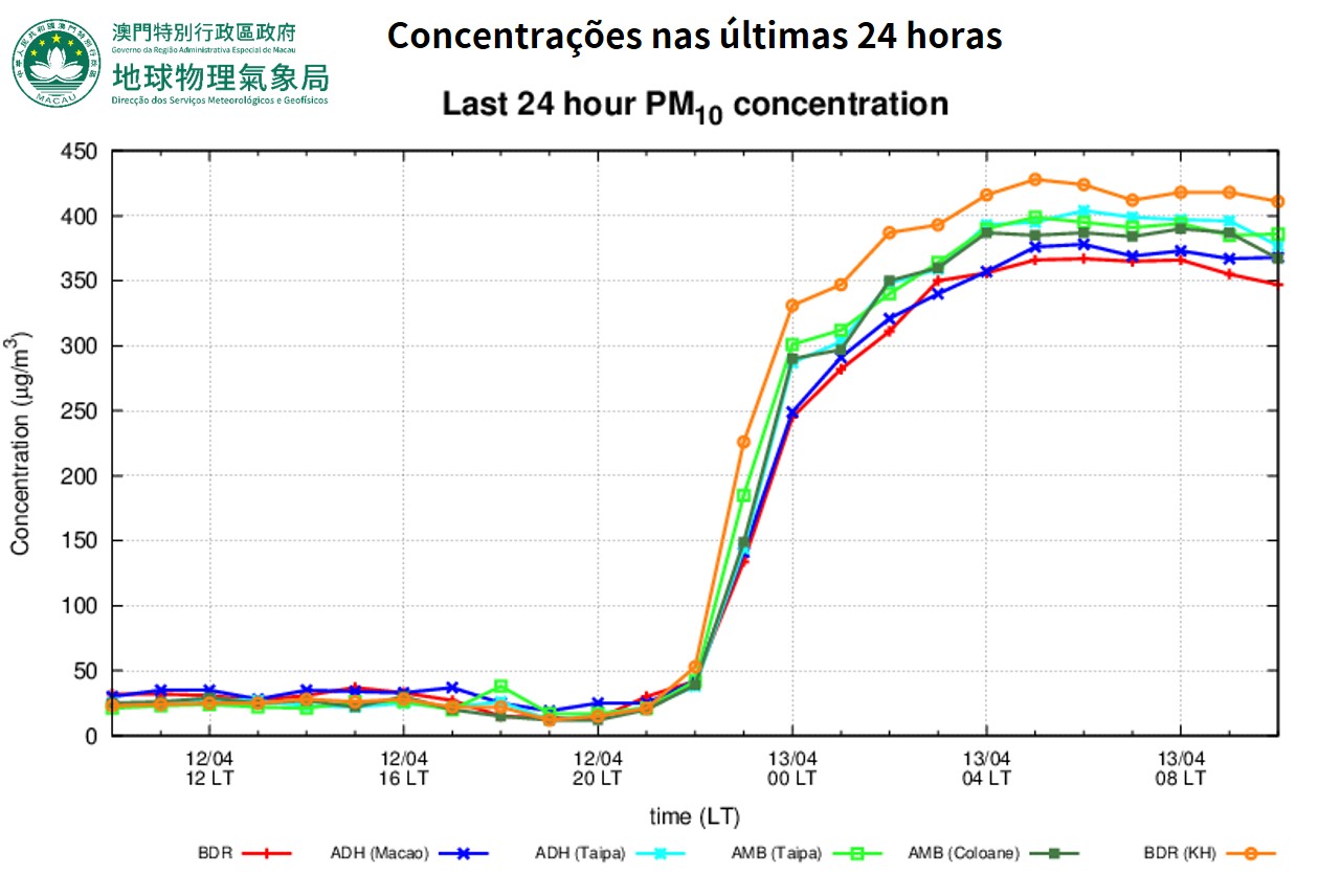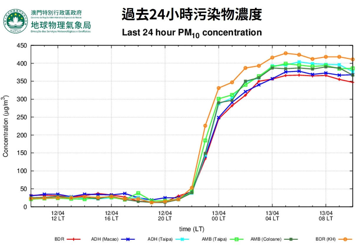 Devido a uma tempestade de poeira, a concentração de poluentes atmosféricos em Macau aumentou hoje significativamente. De acordo com os dados de monitorização da qualidade do ar da DSMG, às 10:00 do dia 13 de abril, a concentração horária de partículas inaláveis em suspensão PM10 em várias estações de monitorização foi superior a 350 μg/m3 (a concentração horária mais elevada foi de 428 μg/m3, registada na estação de beira de estrada Ká-Hó às 5:00 do dia 13 de abril). Prevê-se que a concentração de PM10 se mantenha num nível elevado hoje (13 de abril) e o índice de qualidade do ar poderá atingir o nível "Muito insalubre ou perigoso". A tempestade de poeira foi causada principalmente pelos ventos fortes junto ao solo nas regiões a norte, que varreram a poeira e depois se espalhou para sul, até ao sul da China e ao estuário do Rio das Pérolas, juntamente com a monção de nordeste.