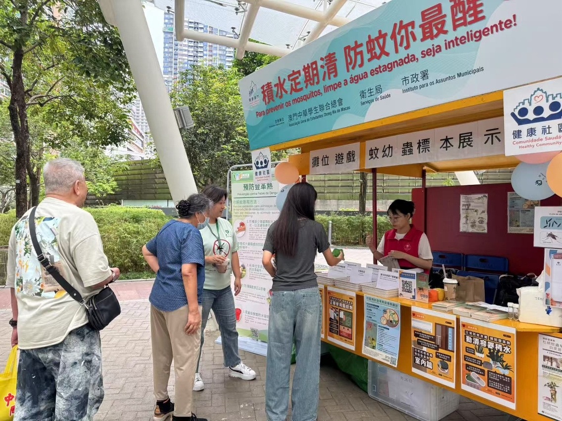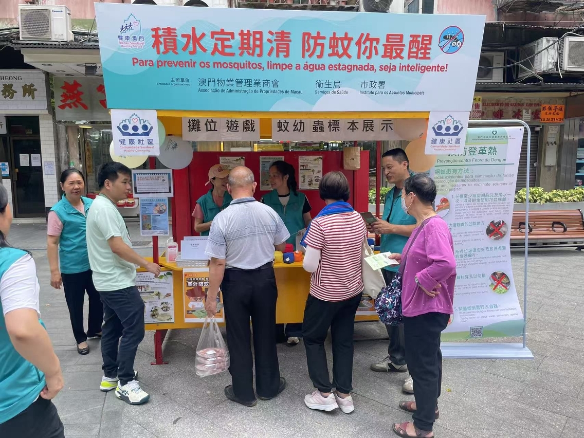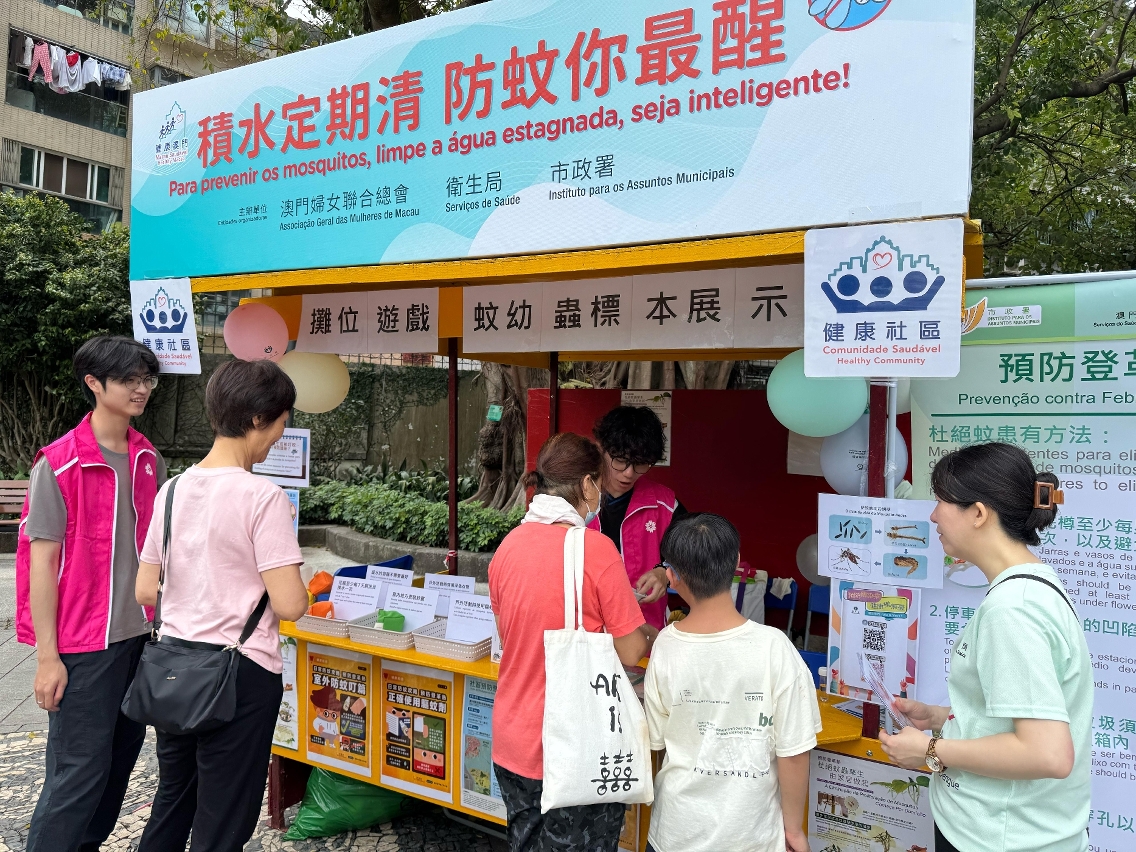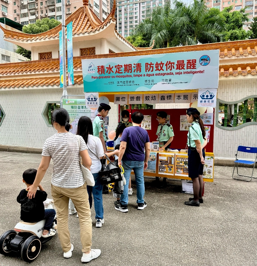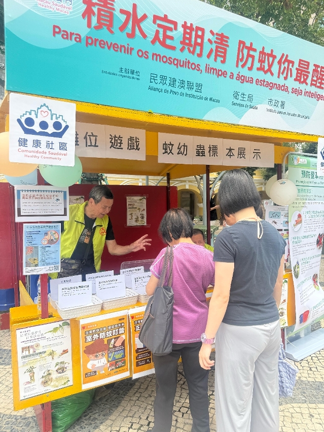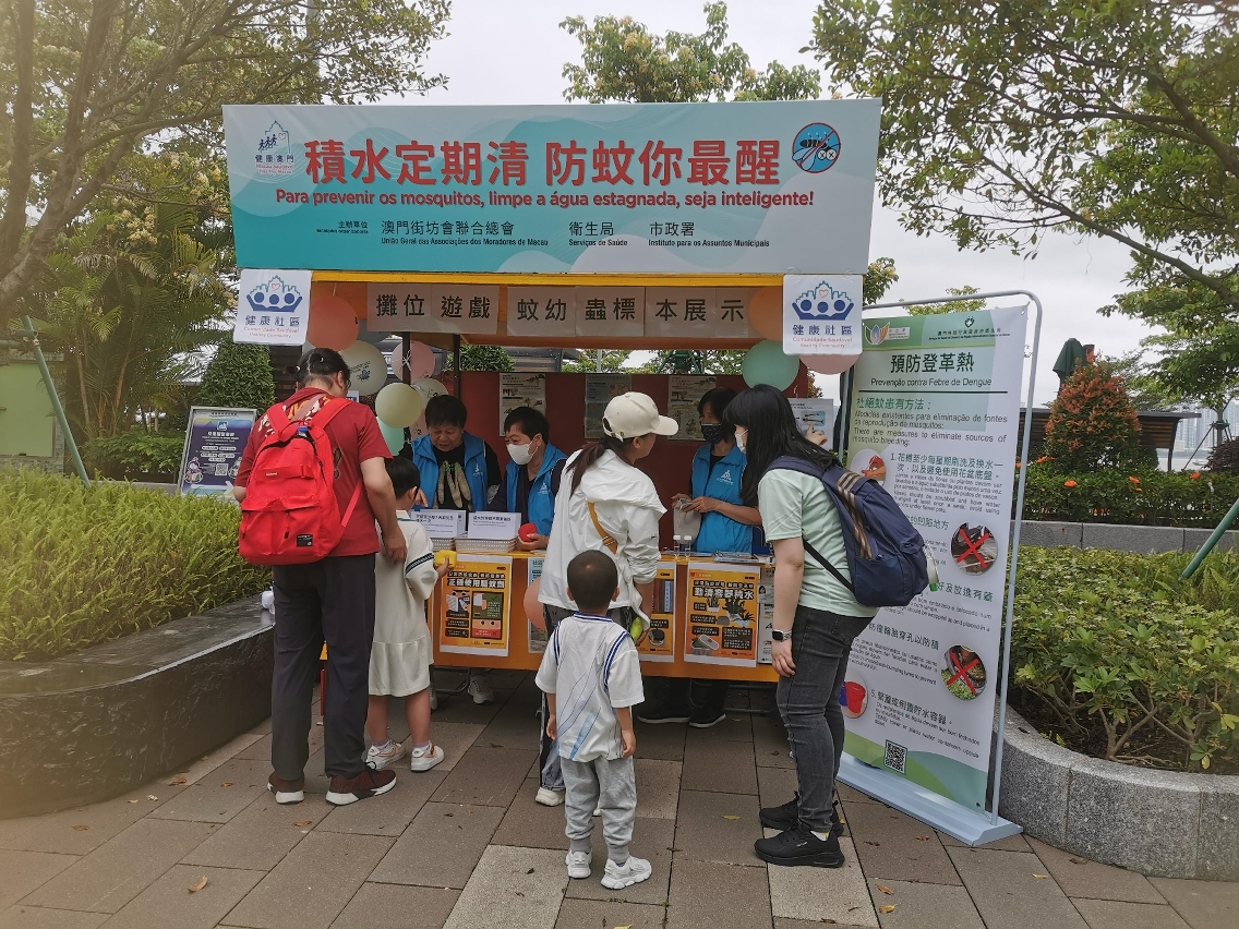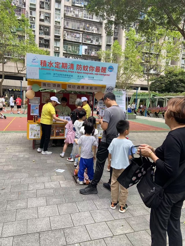 Durante a actividade, os trabalhadores interagiram activamente com os residentes através de jogos, reforçando os seus conhecimentos sobre a adopção correcta das medidas de prevenção de mosquitos. Para que compreendam mais intuitivamente a importância e a eficácia da eliminação das águas estagnadas na prevenção da febre de dengue, nos "postos de divulgação da prevenção contra a febre de dengue na comunidade", foram mostrados espécimes das larvas dos mosquitos, permitindo conhecer o processo de crescimento e os hábitos de vida dos mosquitos Aedes Albopictus. Os mosquitos Aedes Albopictus reproduzem-se principalmente em pequenas quantidades de água estagnada, limpa e parada,. Portanto, é necessário manter a higiene ambiental, eliminar as águas estagnadas nas zonas periféricas do domicílio e no local de trabalho, impedindo a proliferação de mosquitos. Em casa, podem ser instaladas redes mosquiteiras nas janelas, mosquiteiros ou ligar o ar condicionado, entre outras medidas, para reduzir a possibilidade de serem picados por mosquitos. Ao desenvolver actividades ao ar livre, pode optar por vestir roupas com mangas compridas e de cor clara, aplicar repelente anti-mosquitos com ingrediente de DEET (DEET, IR3535 e Icaridin) nas partes expostas da pele ou nas roupas. Em caso de sintomas suspeitos de febre de dengue, como febre e erupção cutânea, deve recorrer de imediato ao médico e informar o médico sobre o local de residência ou histórico de viagem.