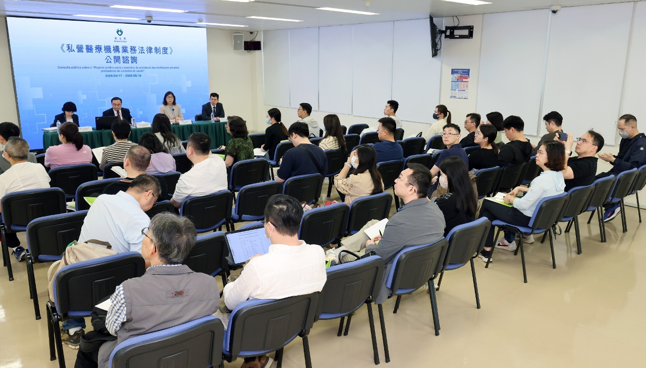 O «Regime jurídico para o exercício de actividade das instituições privadas prestadoras de cuidados de saúde» encontra-se em fase de consulta pública, e durante dois dias consecutivos, 26 e 27 de Abril, os Serviços de Saúde realizaram sessões de consulta pública para auscultar e recolher opiniões. As duas sessões de consulta contaram com a participação de cerca de 80 representantes dos sectores da saúde, indústria, comércio, turismo e residentes, tendo os participantes concordado, de um modo geral, que a revisão da lei contribui para o desenvolvimento do sector e garante a saúde dos residentes. Ao mesmo tempo, foram apresentadas várias opiniões construtivas. Durante a sessão de consulta pública, o Subdirector dos Serviços de Saúde, Dr. Cheang Seng Ip, a Subdirectora Substituta, Dra. Loi I Leng, e outros representantes dos Serviços de Saúde apresentaram o conteúdo do «Regime jurídico para o exercício de actividade das instituições privadas prestadoras de cuidados de saúde» e auscultaram as opiniões dos participantes.
