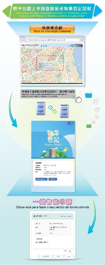 Para promover o desenvolvimento de governação electrónica do Governo da RAEM, procede-se a interligação e interacção entre o sistema de informações da Direcção dos Serviços de Cartografia e Cadastro e o sistema de registo predial da Direcção dos Serviços de Assuntos de Justiça - Conservatória do Registo Predial. A partir de hoje, a população pode clicar o número de descrição predial consultado na “Rede de Informação Cadastral” (https://cadastre.gis.gov.mo/), seleccionando, na mesma página, “Conta Única de Macau” ou “Plataforma para Empresas e Associações” para apresentar directamente o pedido de “Informações escritas de registo predial (electrónica)” ou “Emissão de certidão de registo predial (em suporte de papel ou electrónica)”, o que demonstra plenamente o conceito do Governo da RAEM na prestação de serviço “Mais serviços electronizados, mais conveniência aos cidadãos”.