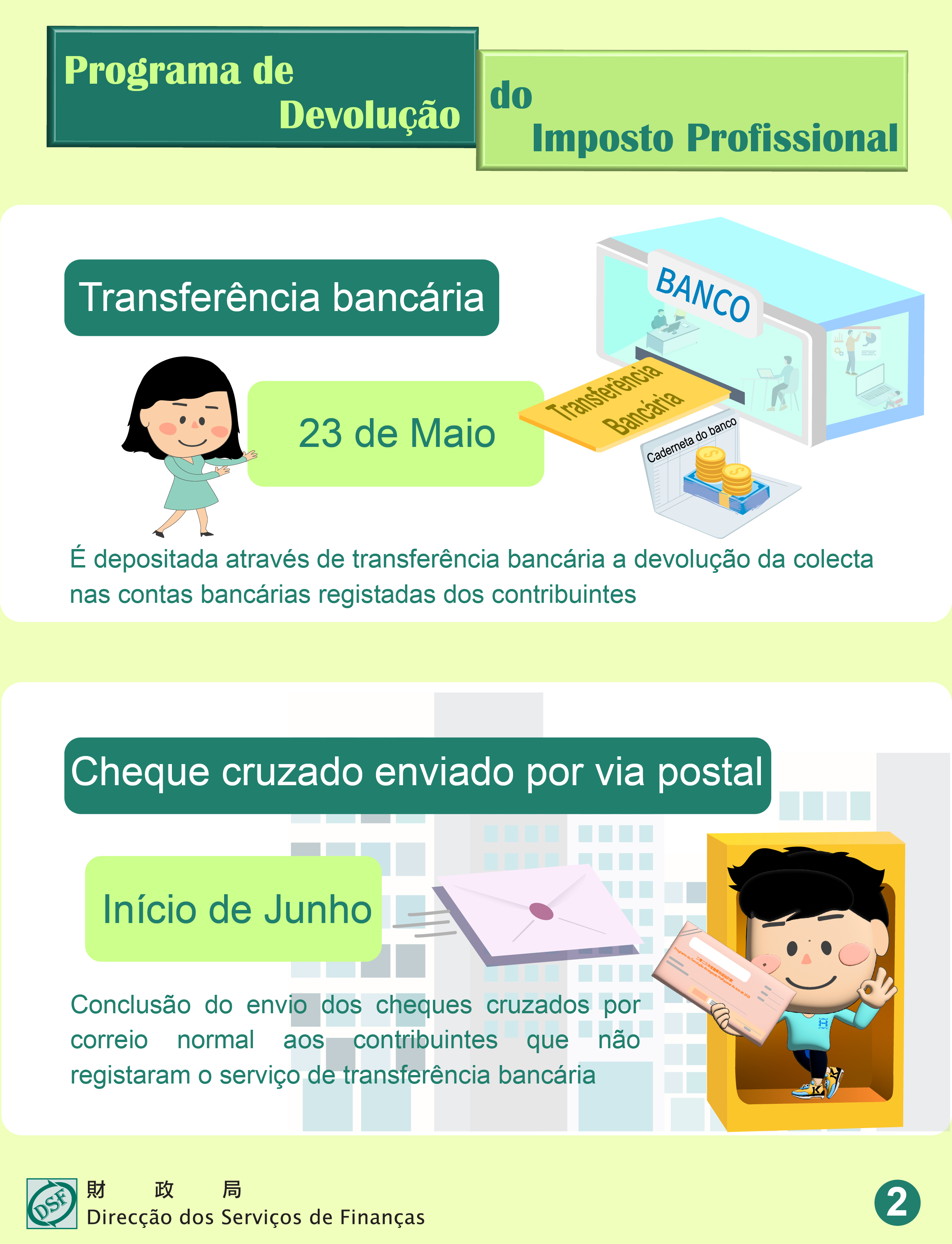 A DSF vai atribuir a devolução da colecta através de transferência bancária ou de cheque cruzado enviado por via postal. No dia 23 de Maio é depositada a devolução da colecta nas contas bancárias dos contribuintes registados para a transferência bancária, enquanto para aqueles não registados são enviados sucessivamente, os cheques cruzados conforme os endereços de correspondência fiscal registados em sede de imposto profissional nestes Serviços, esperando-se a conclusão dos trabalhos de envio dos cheques cruzados no início de Junho.