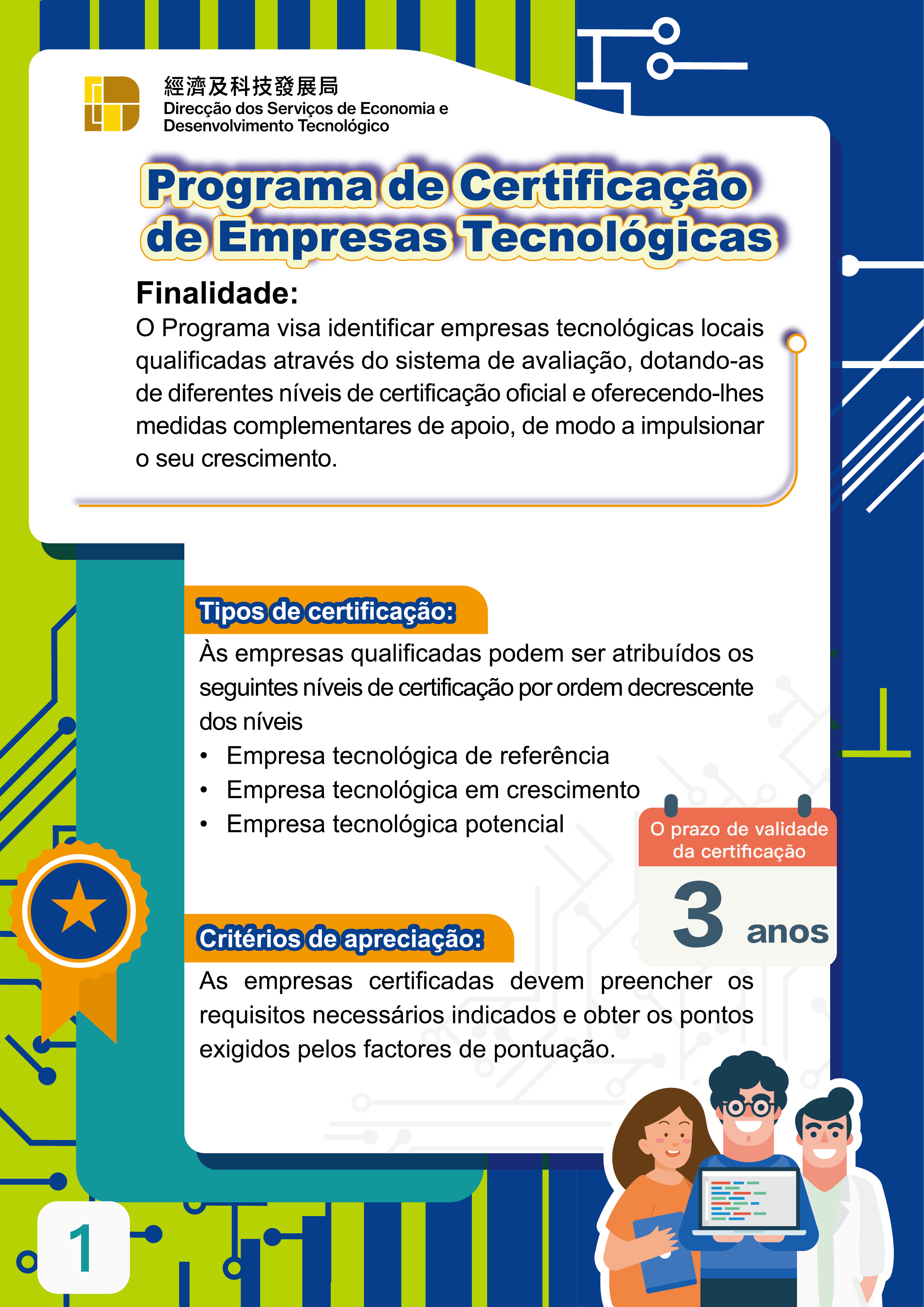 Em articulação com as estratégias de desenvolvimento da diversificação adequada «1+4» do Governo da RAEM e para aperfeiçoar empenhadamente o sistema e o ambiente político para o desenvolvimento da indústria científica e tecnológica, a Direcção dos Serviços de Economia e Desenvolvimento Tecnológico (DSEDT) continua a lançar o Programa de Certificação de Empresas Tecnológicas (Programa), que visa identificar empresas tecnológicas locais qualificadas através do sistema de avaliação, construindo uma escada de crescimento para empresas tecnológicas locais, de modo a ajudá-las a desenvolverem-se. Actualmente há um total de 41 empresas às quais foi atribuída a certificação da qualificação de empresa tecnológica, abrangendo diferentes áreas como circuitos integrados, tecnologias de informação, inteligência artificial e medicina tradicional chinesa.