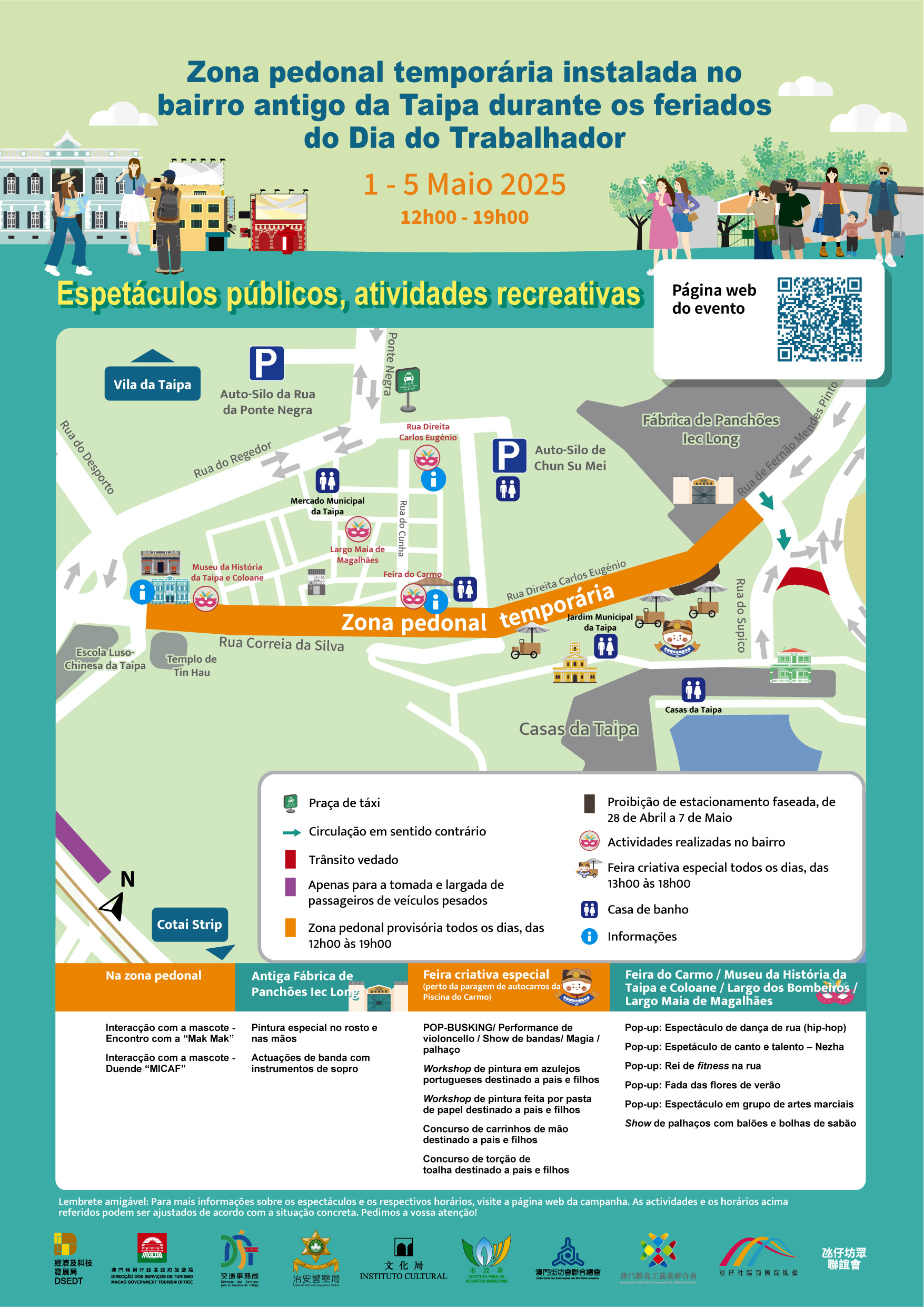 Com vista a garantir a circulação ordenada de pessoas e de veículos no bairro antigo da Taipa durante os feriados do Dia do Trabalhador e criar um ambiente confortável e seguro, a Direcção dos Serviços de Economia e Desenvolvimento Tecnológico (DSEDT), a Direcção dos Serviços para os Assuntos de Tráfego (DSAT), o Corpo de Polícia de Segurança Pública (CPSP), a Direcção dos Serviços de Turismo (DST), o Instituto Cultural e o Instituto para os Assuntos Municipais (IAM), cooperaram com a União Geral das Associações dos Moradores de Macau, a Associação Promotora para o Desenvolvimento da Comunidade da Taipa, a Associação de Moradores da Taipa e a Federação Industrial e Comercial das Ilhas de Macau na criação da “Zona pedonal temporária instalada no bairro antigo da Taipa durante os feriados do Dia do Trabalhador”.