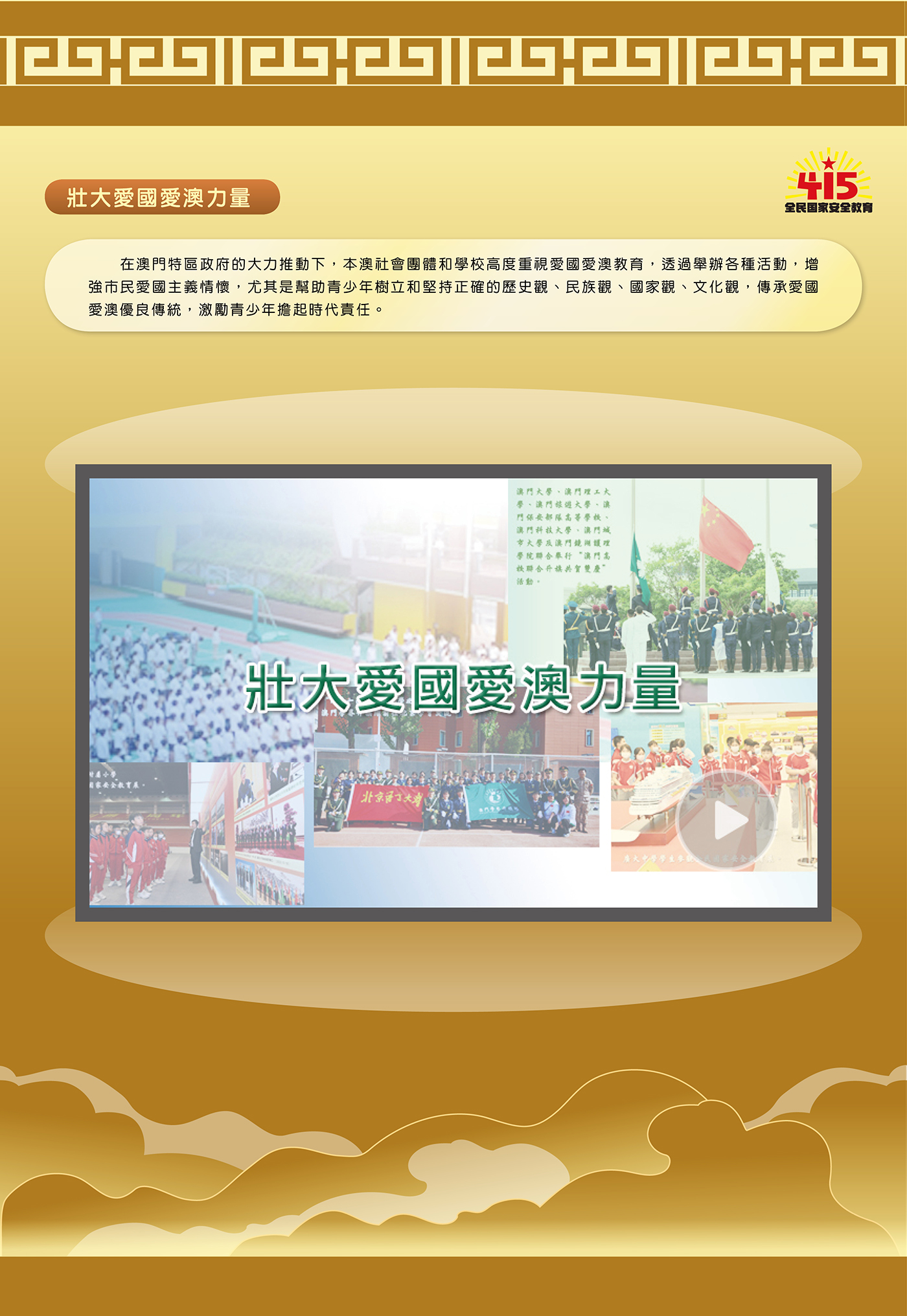 Com grande impulso do governo da RAEM, as associações e instituições de ensino dão elevada atenção à educação de amor à Pátria e a Macau, organizam diversas actividades, com objectivo de reforçar a consciência patriótica dos residentes, especialmente de apoiar os jovens a criarem e instarem valores correctos sobre a história, a nação, o País, a cultura, de transmitir as boas tradições de amor à Pátria e a Macau, de encorajar os jovens a responsabilizarem-se por esta era, de fortalecer ainda mais as forças de amor à Pátria e a Macau.