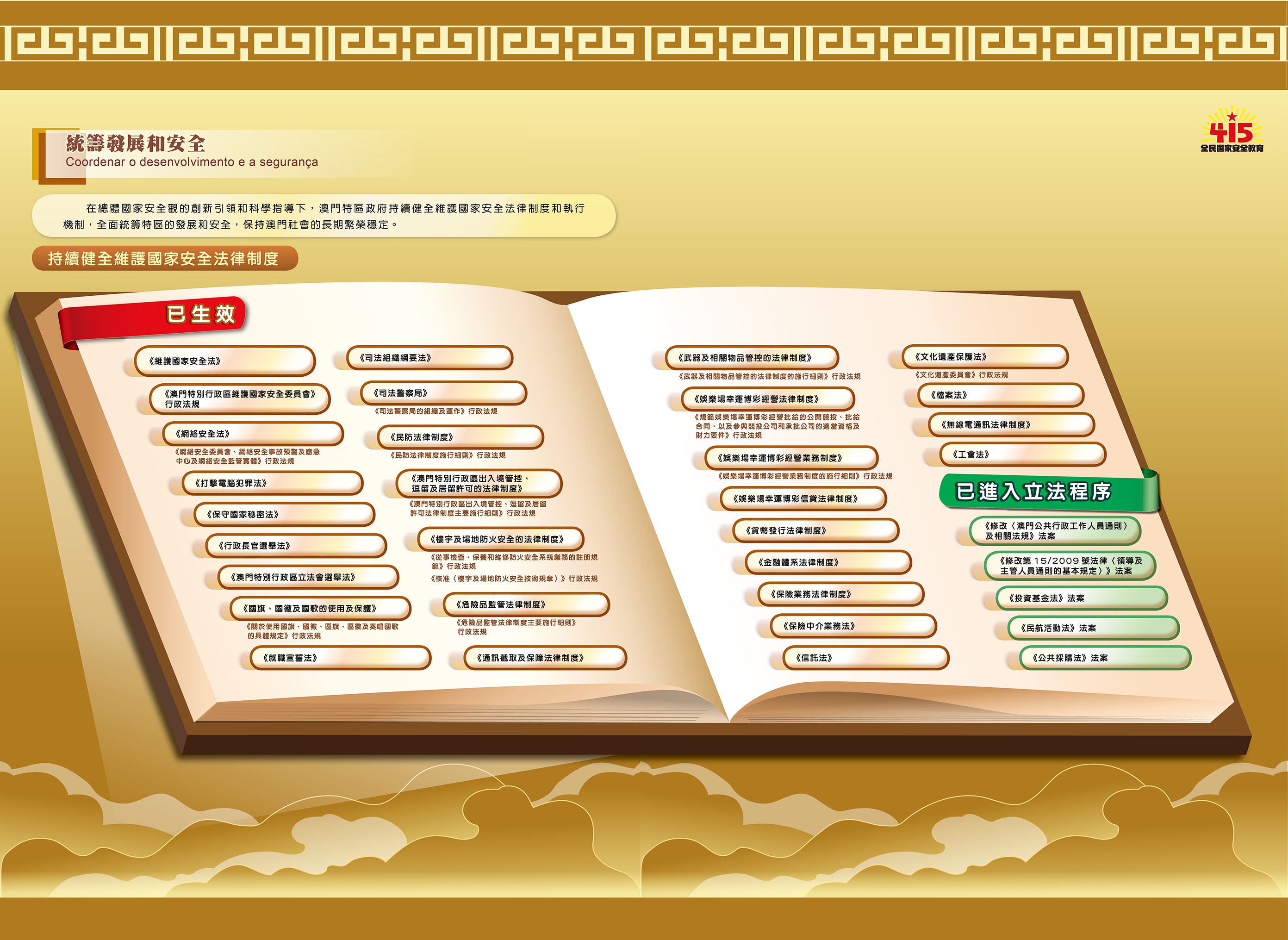 O tema da quarta parte da exposição é «Ter sempre em mente as instruções e assumir responsabilidades - Avançar para um novo patamar de prosperidade e estabilidade social». Sob a orientação renovada e instrução científica da Perspectiva Geral da Segurança Nacional, o governo da RAEM continua a aperfeiçoar o regime jurídico de salvaguarda da segurança nacional, lançou uma série de leis e regulamentos relativos à segurança nacional, e promove a legislação complementar sobre a segurança nacional. A RAEM concluiu as alterações da Lei Eleitoral para o Chefe do Executivo e da Lei Eleitoral para a Assembleia Legislativa da RAEM, garantindo, com base no regime jurídico e ao nível de mecanismo de implementação, que as pessoas que participem nas respectivas eleições sejam patriotas, fazendo com que o princípio de “Macau governado por patriotas” seja concretizado efectivamente. Ao mesmo tempo, o governo da RAEM concretiza activamente a Perspectiva Geral da Segurança Nacional, continua a aperfeiçoar o sistema institucional e o mecanismo de implementação, consolida efectivamente a linha de defesa da segurança nacional.