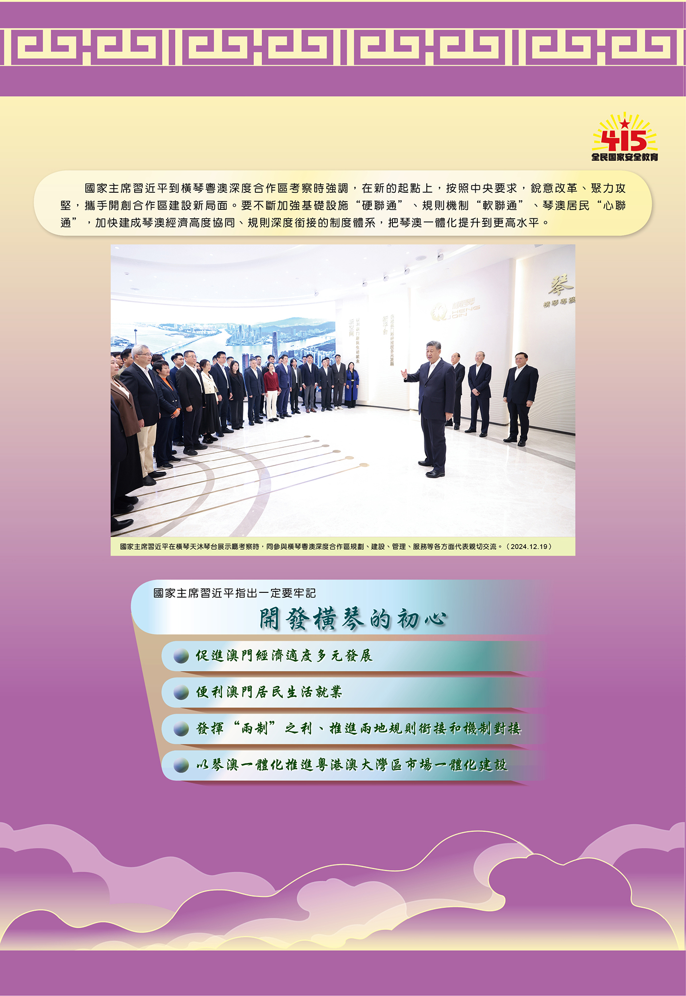 Nos últimos dez anos, sob a orientação da Perspectiva Geral da Segurança Nacional, a educação da segurança nacional na RAEM tem aprofundado de forma constante e conseguiu resultados notáveis, tem aumentado a consciência de segurança nacional de toda a população, tem contribuído para a transmissão entre as gerações da tradição do amor à Pátria e a Macau. A Exposição sobre a Educação da Segurança Nacional, co-organizada pelo Governo da RAEM e o Gabinete de Ligação do Governo Popular Central na RAEM, realiza-se pela oitava vez, registando, até o dia 1 de Maio, mais de 36 mil visitantes e mais de 92 727 navegações na respectiva página electrónica.