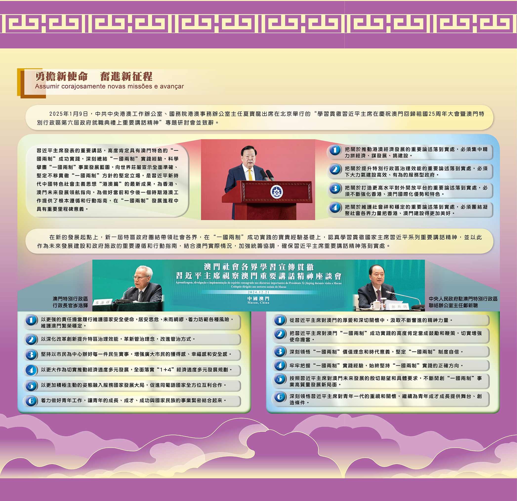 O novo governo da RAEM reuniu e liderou todos os sectores locais para estudar e implementar o espírito consagrado nos discursos importantes do presidente Xi Jinping. O Chefe do Executivo, Sam Hou Fai presidiu sete seminários, respectivamente com os representantes das cinco tutelas e dos Comissariados contra a Corrupção e da Auditoria, e solicitou que os funcionários de todos os serviços públicos estudem e compreendam profundamente os conteúdos, pontos de vista e metodologia dos discursos importantes do presidente Xi Jinping, articulando-os com os seus trabalhos práticos das respectivas áreas, com vista a cumprirem as suas competências efectivamente de acordo com a lei, fortalecerem o seu empenho, responsabilidade e consciência da conjuntura global.