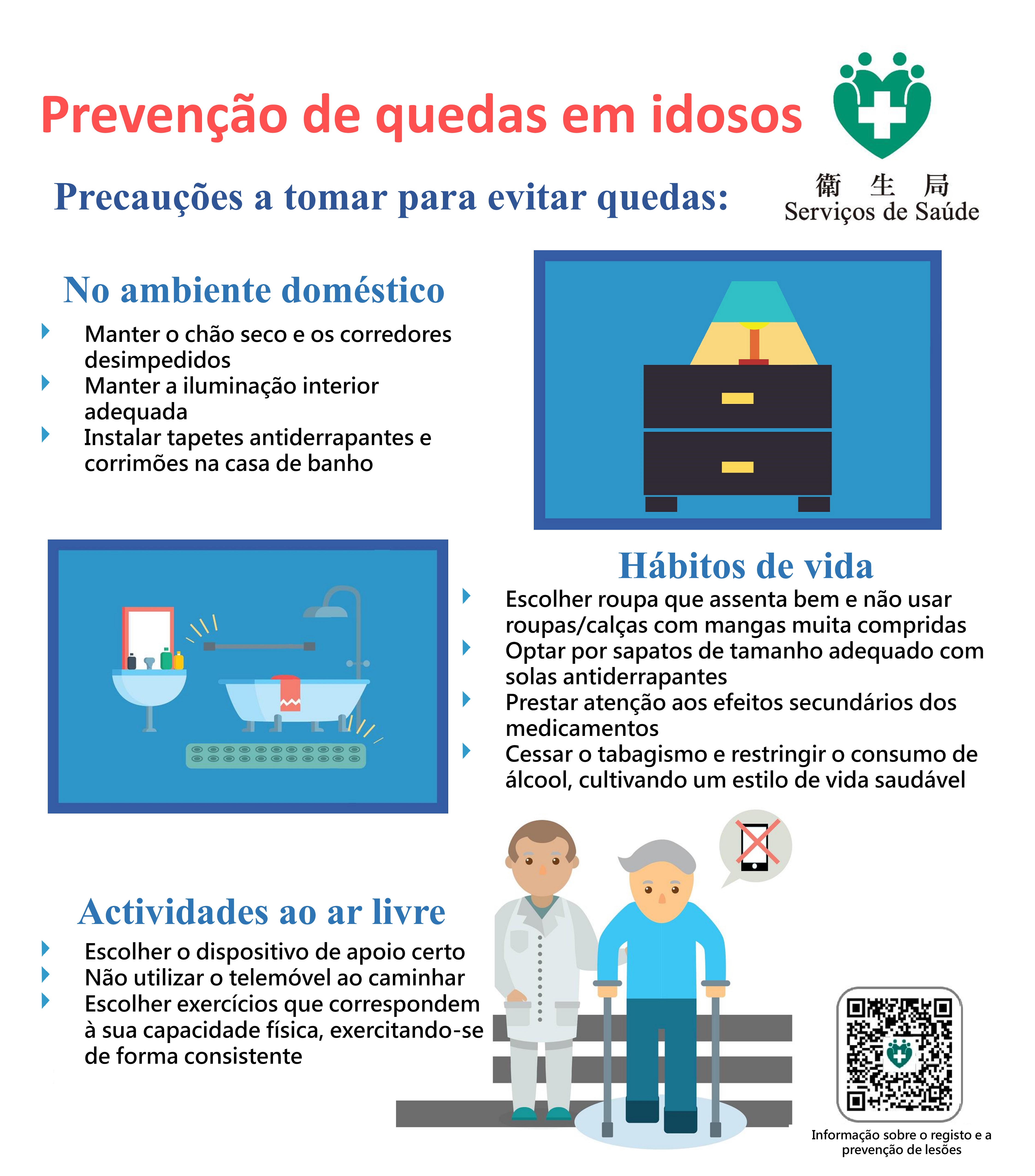 Os Serviços de Saúde alertam que, o risco de queda, de idosos sofridos das doenças crónicas, degeneração visual, entre outros factores, pode ser significativamente aumentado, e causar consequências graves, tais como fracturas ósseas, traumatismos cerebrais, entre outros. A prevenção de quedas não é apenas uma medida importante para assegurar a saúde, mas também a chave para melhorar a qualidade de vida.