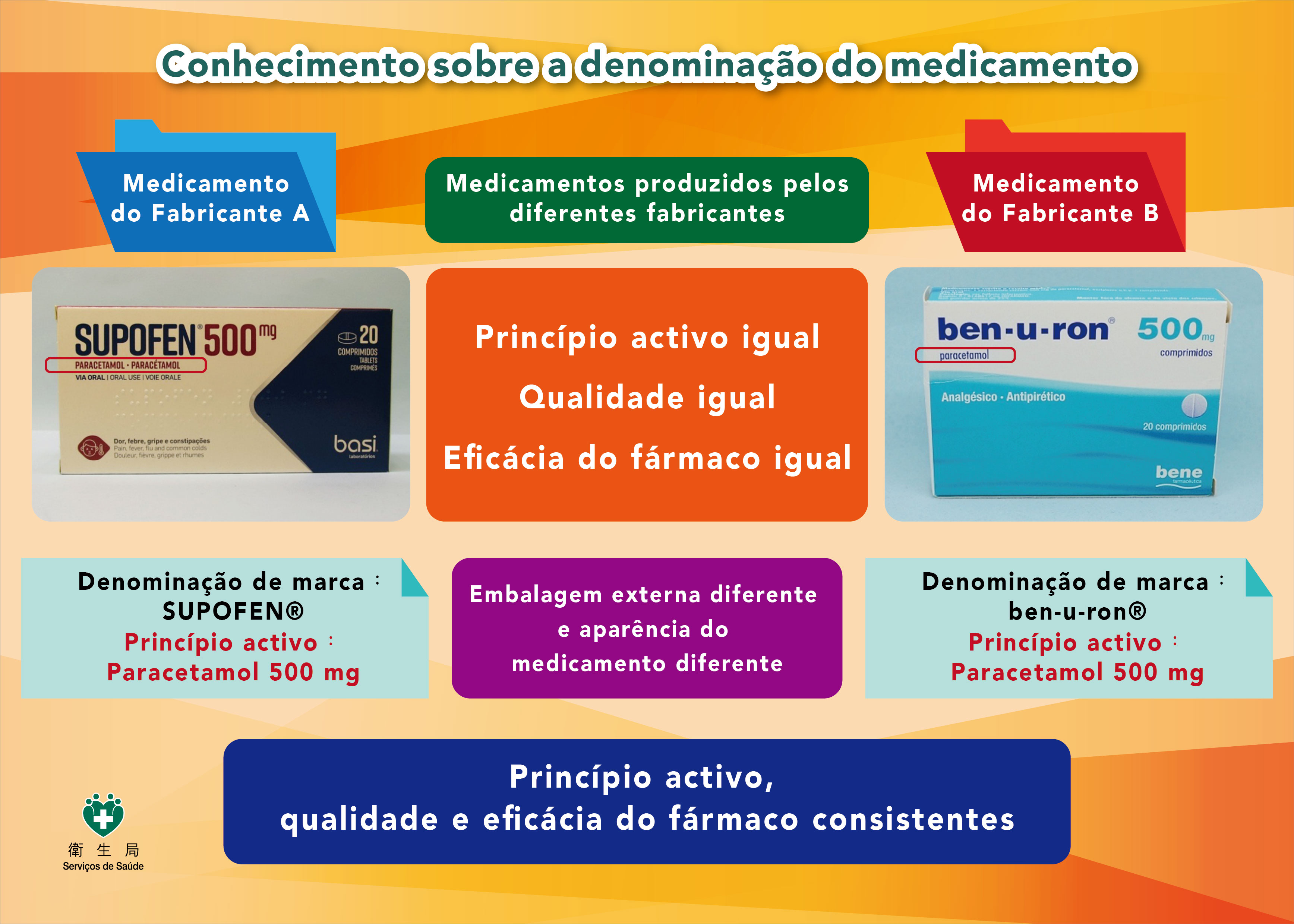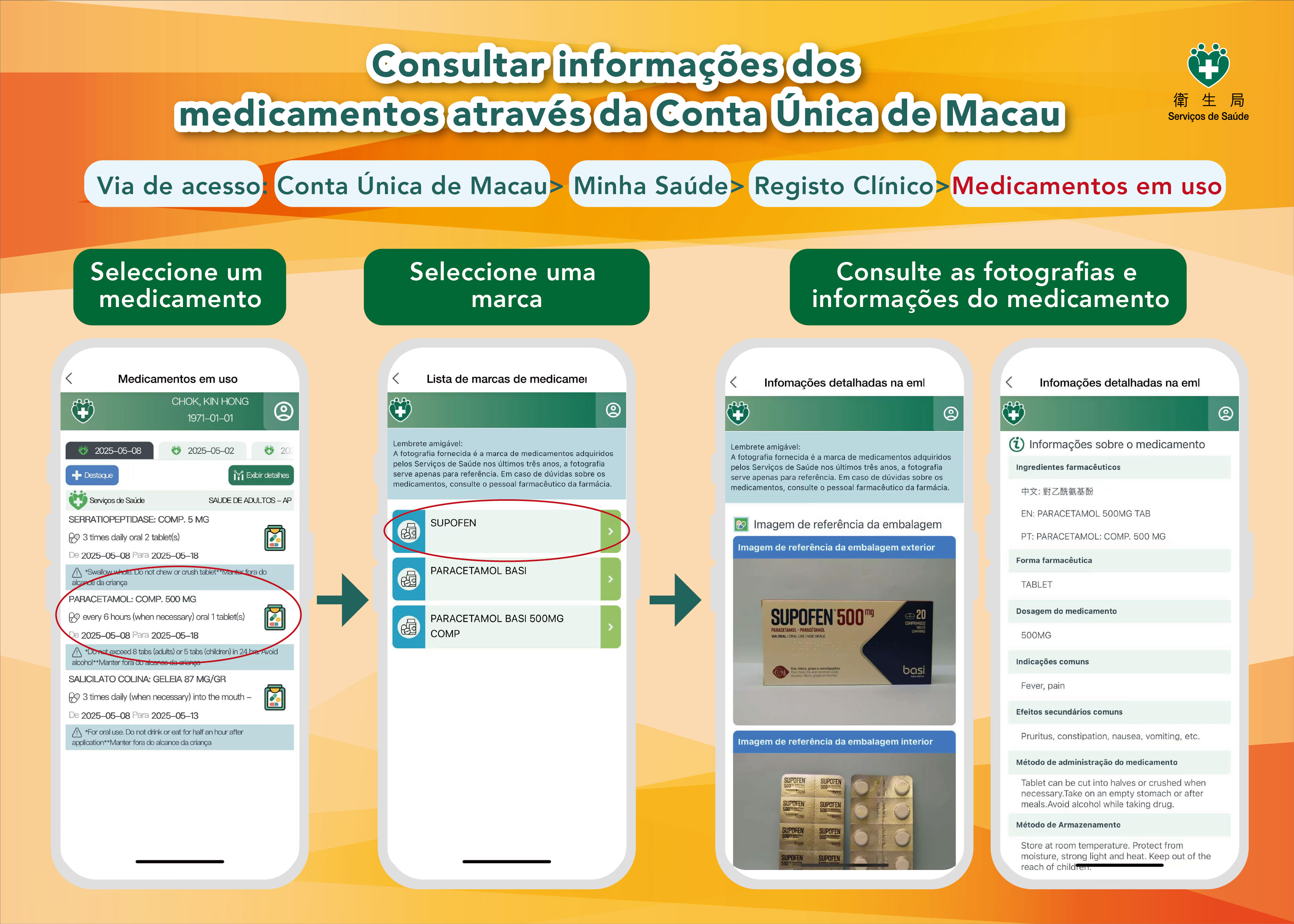 Os residentes podem aceder à Conta Única de MacauàMinha SaúdeàRegisto ClínicoàMedicamentos em uso, e optar por medicamentos prescritos por médico, para visualizar os medicamentos que foram adquiridos pelos Serviços de Saúde nos últimos anos e que possuem o mesmo princípio activo, mas de marca diferente dos respectivos medicamentos. Caso seleccionem uma marca de medicamento correspondente, podem consultar as informações como fotografias, composição, forma, dosagens, indicações comuns, efeitos secundários possíveis e posologia do fármaco, etc.