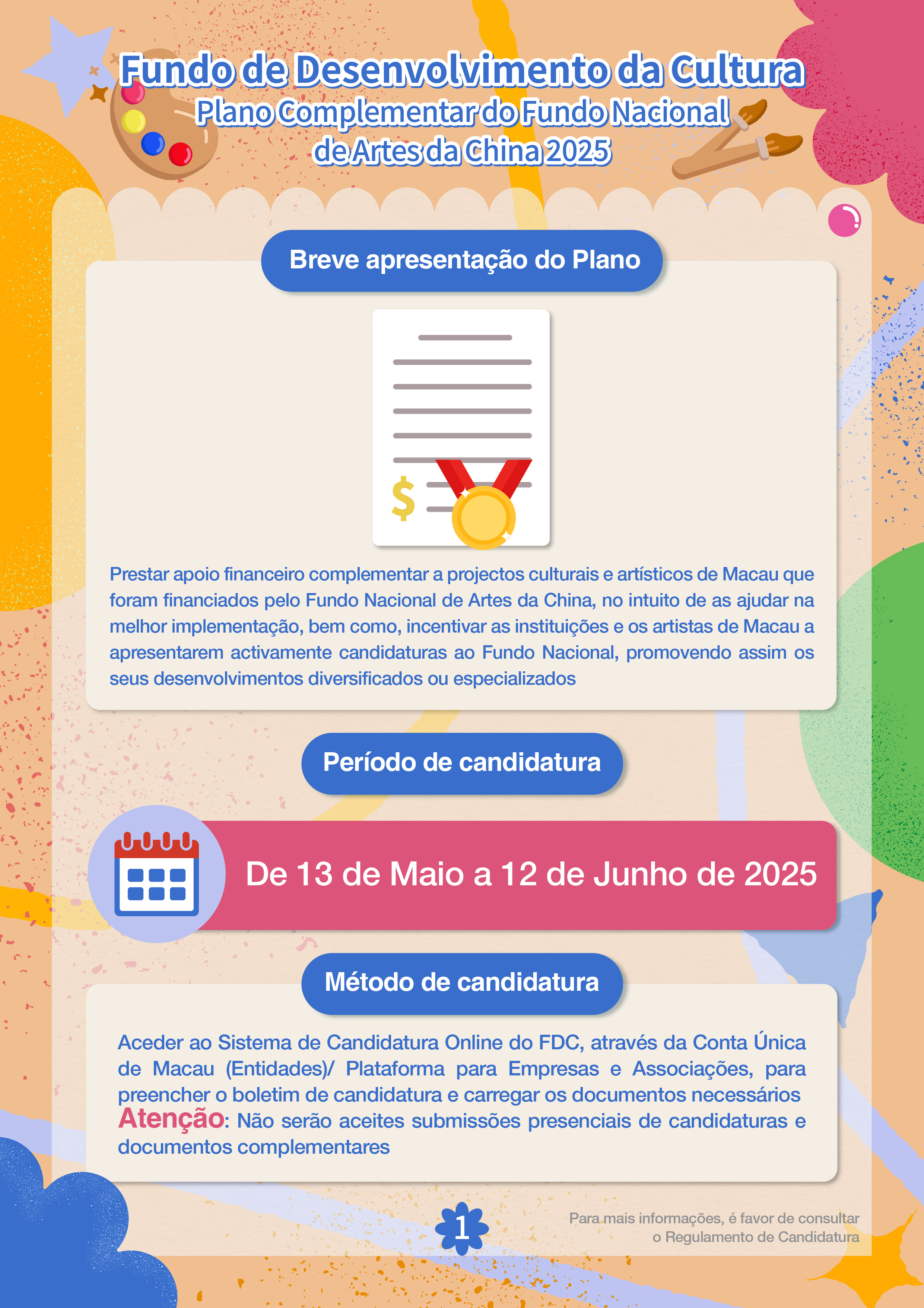 O Fundo de Desenvolvimento da Cultura (FDC) continua a lançar o “Plano Complementar do Fundo Nacional de Artes da China”, para apoiar a implementação de projectos culturais e artísticos de Macau que foram financiados pelo Fundo Nacional de Artes da China (adiante designado por “Fundo Nacional”). O período de candidatura decorrerá de 13 de Maio a 12 de Junho.