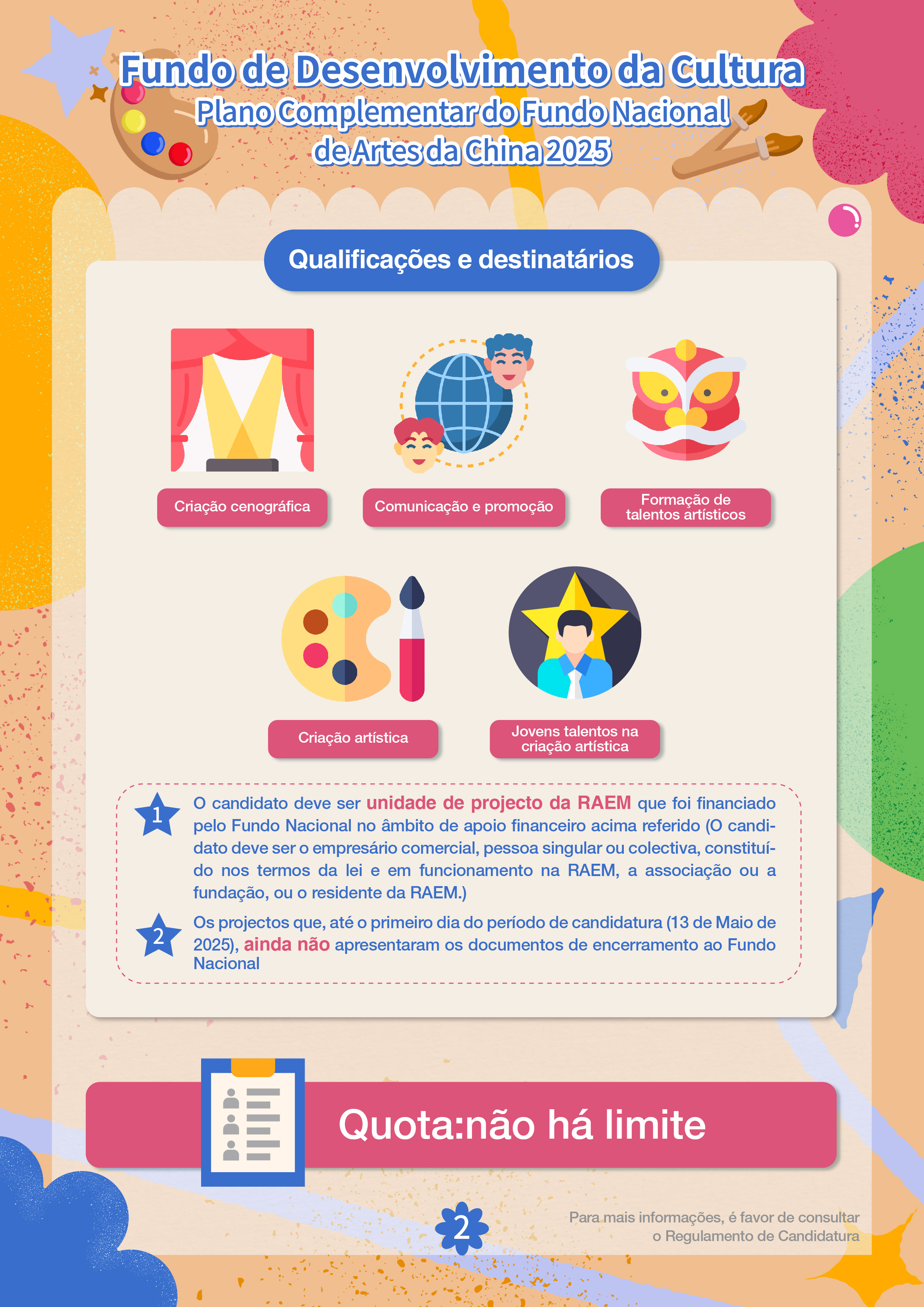 O candidato deve ser unidade de projecto da RAEM que foi financiado pelo Fundo Nacional no âmbito de “criação cenográfica”, “comunicação e promoção”, “formação de talentos artísticos”, bem como “criação artística” e “jovens talentos na criação artística”, devendo ainda ser o empresário comercial, pessoa singular ou colectiva, constituído nos termos da lei e em funcionamento na RAEM, a associação ou a fundação, ou o residente da RAEM. O projecto candidato não deve ter sido apresentado, até 13 de Maio de 2025, ao Fundo Nacional para encerramento.