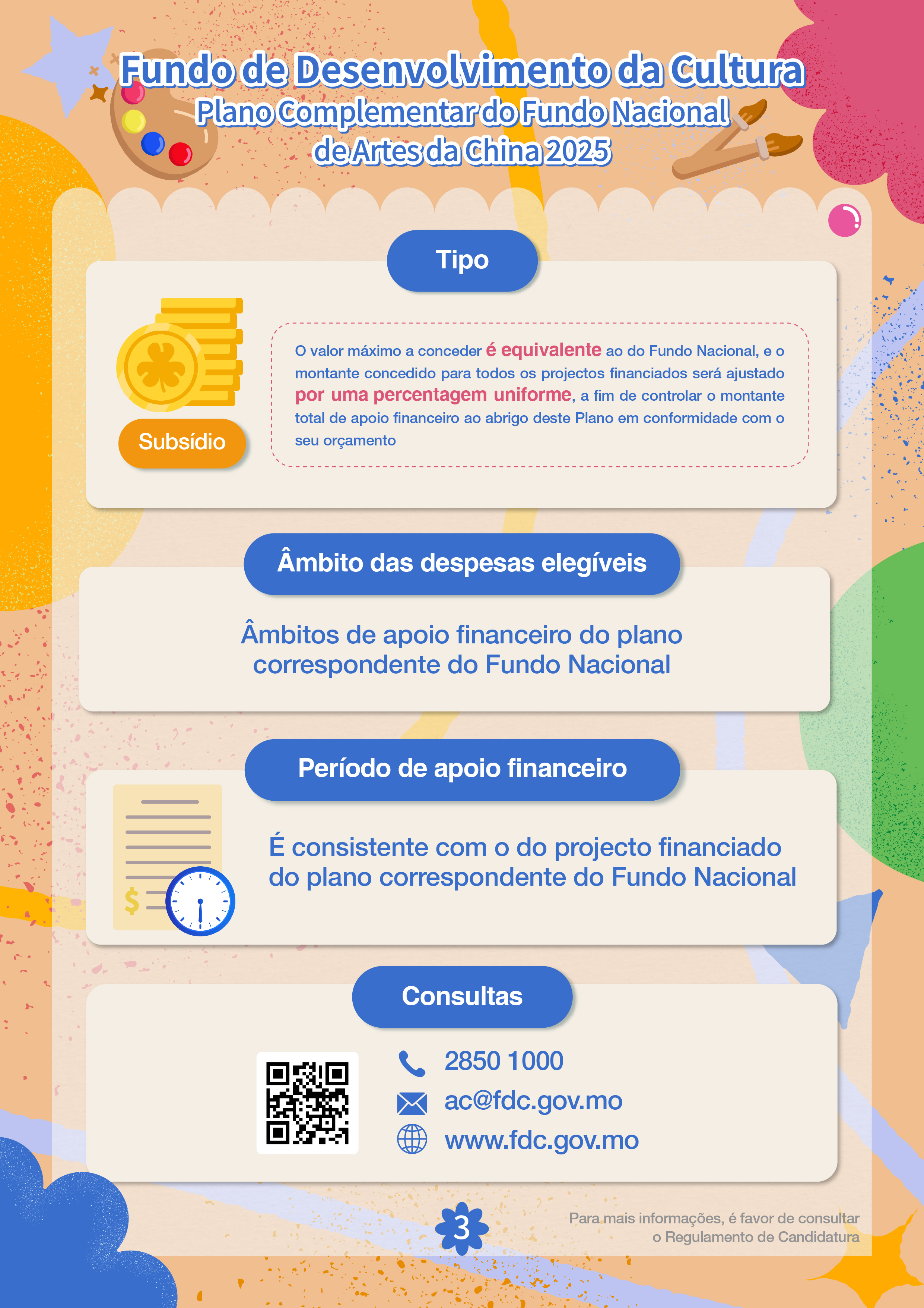 O apoio financeiro deste Plano será prestado na forma de subsídio e não há número máximo de beneficiários. Para apoiar ainda mais o bom andamento dos projectos financiados pelo Fundo Nacional em Macau, o FDC irá, em 2025, aumentar a percentagem de apoio financeiro de 50% para 1:1. Além disso, o âmbito e período de apoio financeiro permanecerão os mesmos que os dos projectos financiados pelo Fundo Nacional. Os interessados podem consultar o Regulamento do Plano sobre os detalhes de candidatura e contactar-nos, através do n.º de telefone, 2850 1000 ou por email, ac@fdc.gov.mo, para qualquer dúvida.