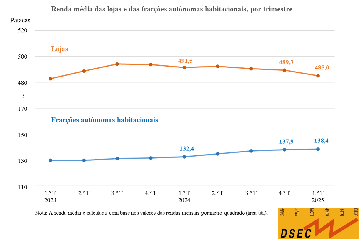 No primeiro trimestre de 2025 a renda média por metro quadrado (área útil) das fracções autónomas destinadas a lojas cifrou-se em 485 Patacas, menos 0,9%, face ao quarto trimestre de 2024. A renda média das fracções autónomas destinadas a escritórios (290 Patacas) e a das fracções autónomas industriais (123 Patacas) desceram 1,3% e 0,2%, respectivamente, em termos trimestrais, porém a das fracções autónomas habitacionais (138 Patacas) cresceu 0,4%, em termos trimestrais, informam os Serviços de Estatística e Censos.