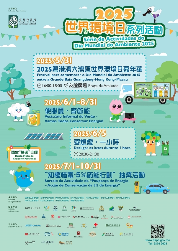 Em resposta ao Dia Mundial do Ambiente, que se comemora anualmente no dia 5 de Junho, a Direcção dos Serviços de Protecção Ambiental (DSPA) continua a organizar a “Série de Actividades do Dia Mundial do Ambiente”, com vista a promover, junto do público, a prática de actos ambientais e de redução de carbono, através de uma série de actividades a desenvolver em articulação com a concretização da “Dupla Meta de Carbono” nacional. Para as actividades, são convidados os departamentos de protecção ambiental da Grande Baía Guangdong-Hong Kong-Macau, diversos serviços públicos, associações, complexos de entretenimento e hotéis, bem como outros organismos de Macau, para, nesta data em que anualmente se comemora a nível internacional a protecção ambiental organizarem, em conjunto, nomeadamente, o “Festival para comemorar o Dia Mundial do Ambiente entre Guangdong-Hong Kong-Macau”, as iniciativas “Desligar as luzes durante 1 hora” e “Vestuário Informal de Verão - Vamos Todos Conservar Energia!”, e o Sorteio da Actividade de “Poupança de Energia – Acção de Conservação de 5% de Energia”. Espera-se aprofundar a cooperação e o intercâmbio na área da protecção ambiental na Grande Baía Guangdong-Hong Kong-Macau, incentivar os cidadãos a pôr em prática a redução de resíduos e de plástico, bem como responder à vida verde de baixo carbono, construindo, em conjunto, uma bela Baía.