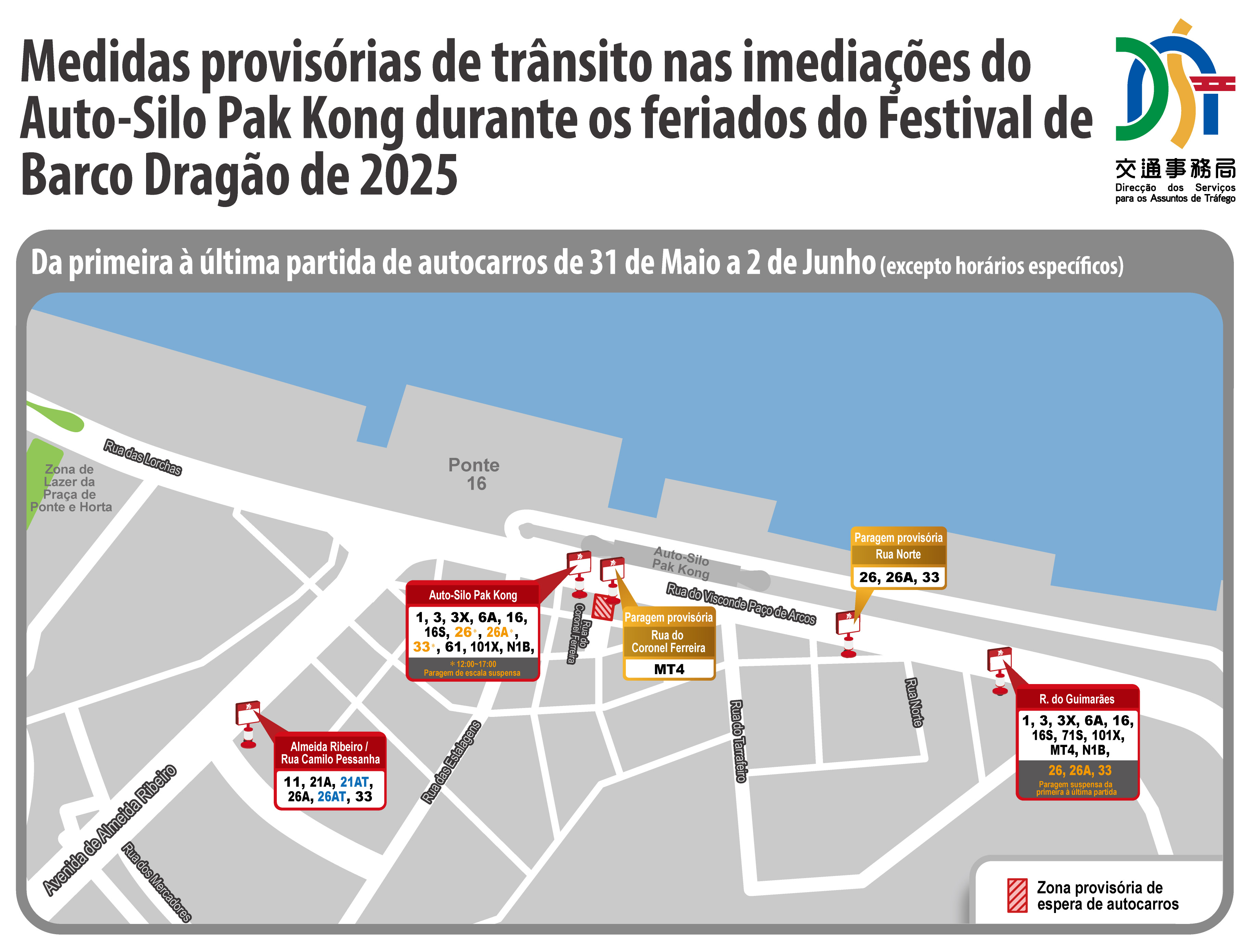 No que diz respeito ao serviço de autocarros, tomando como referência os planos de triagem adoptados no passado, haverá medidas provisórias no lado este da Praça das Portas do Cerco e nas imediações da Avenida de Almeida Ribeiro. As duas operadoras irão aumentar as partidas de autocarros e operar as carreiras sazonais n.os 3BX, 17T, 21AT, 26AT durante os dias 31 de Maio a 2 de Junho para acelerar o escoamento de passageiros. Em articulação com essas disposições, será necessário implementar condicionamentos ao trânsito nas vias envolventes (vide o mapa I). Para mais informações sobre as disposições provisórias do serviço de autocarros, podem consultar os mapas II, III e as páginas electrónicas das duas operadoras de autocarros (TCM: http://www.tcm.com.mo e Transmac: http://www.transmac.com.mo).